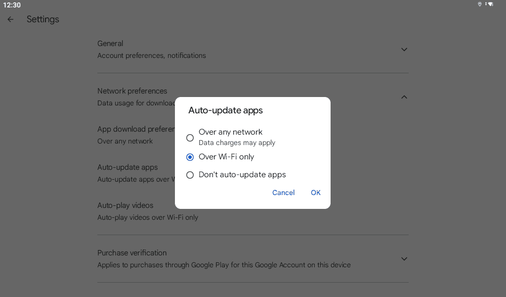 - Over Wi-Fi only to update apps only when connected to Wi-Fi.