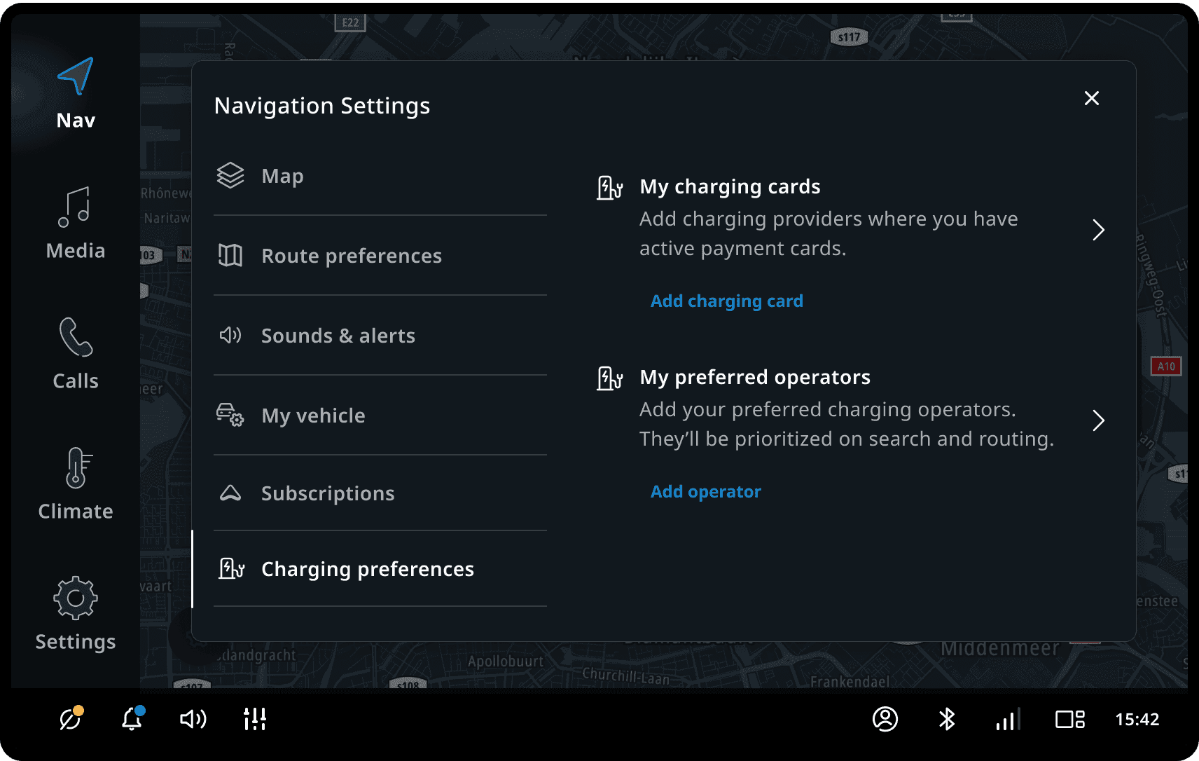 支付偏好过滤器允许用户应用过滤,仅查看选定的充电点运营商(CPO)或特定充电服务提供商(eMSP)。该功能为用户提供定制的充电站概览,确保他们提前了解可以在哪里为车辆充电。可用的 CPO 列表由用户当前所在国家最受欢迎的运营商组成的排名选择。此外,可用的充电卡由用户的充电偏好决定,详见 Charging Preferences。