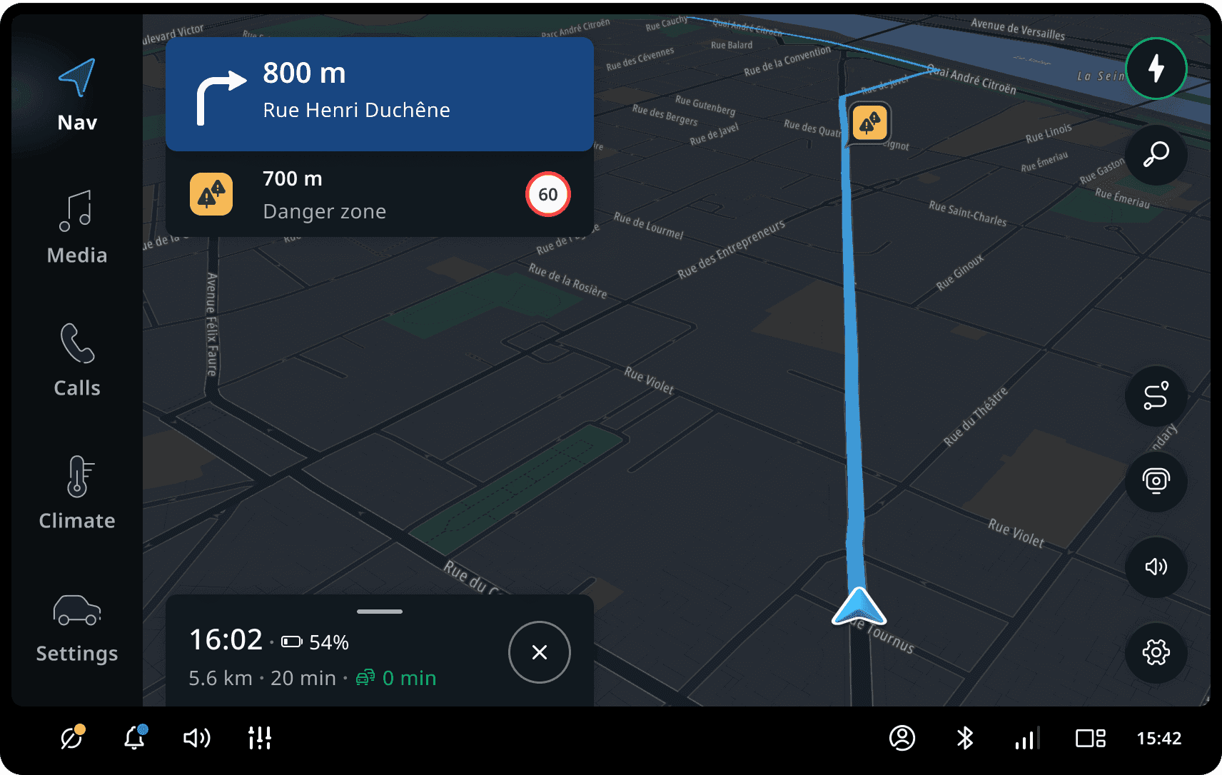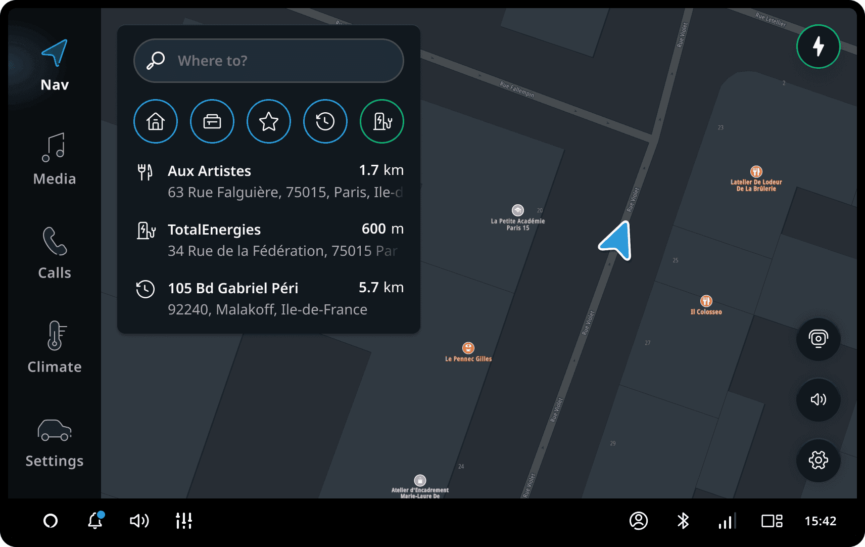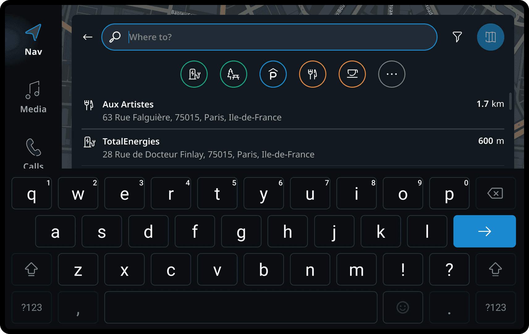 地图上有一个专用的充电站查找按钮,作为搜索充电站的快捷方式。该按钮在驾驶时也可用。