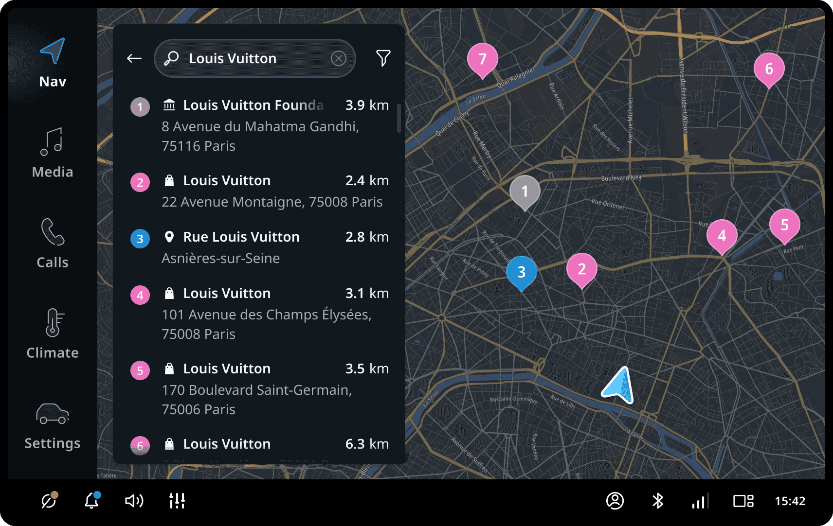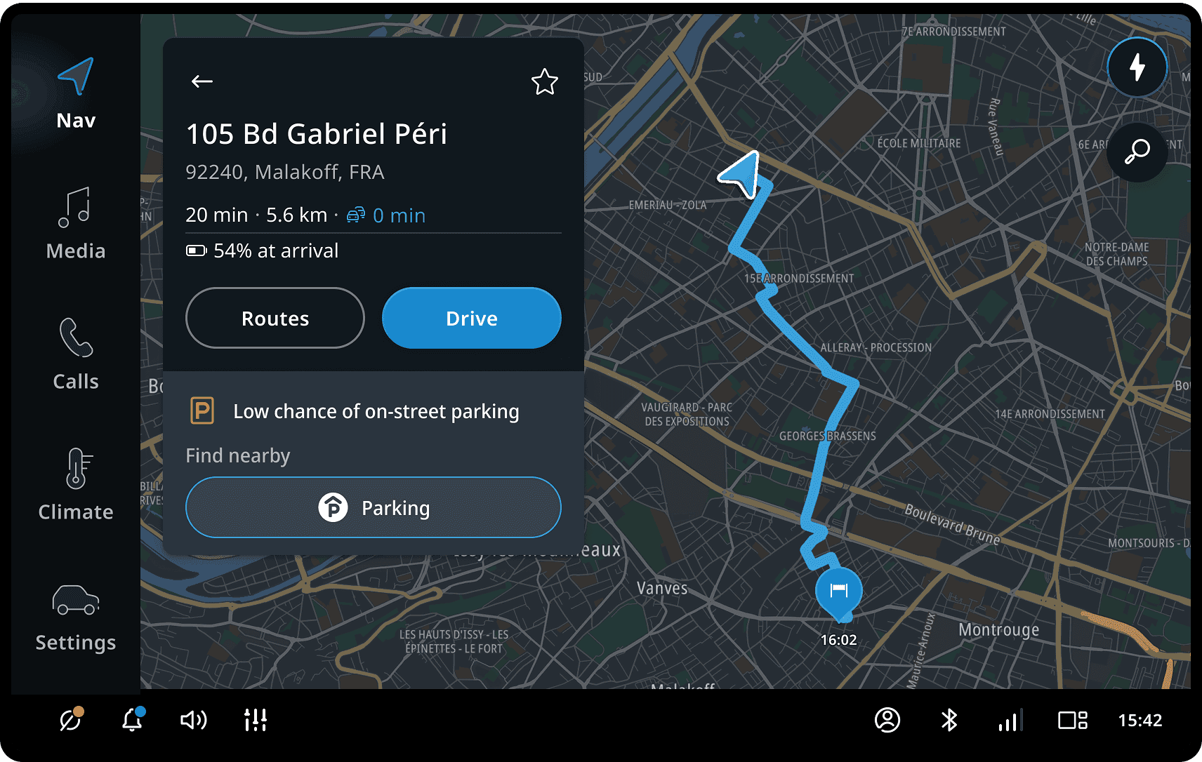应用的路径规划解决方案提供了绕开交通(及适用限制)的最优路线,并根据需要实时更新。用户可以通过自由文本搜索或直接从地图上选择位置。位置也可以保存为收藏,便于以后快速访问。