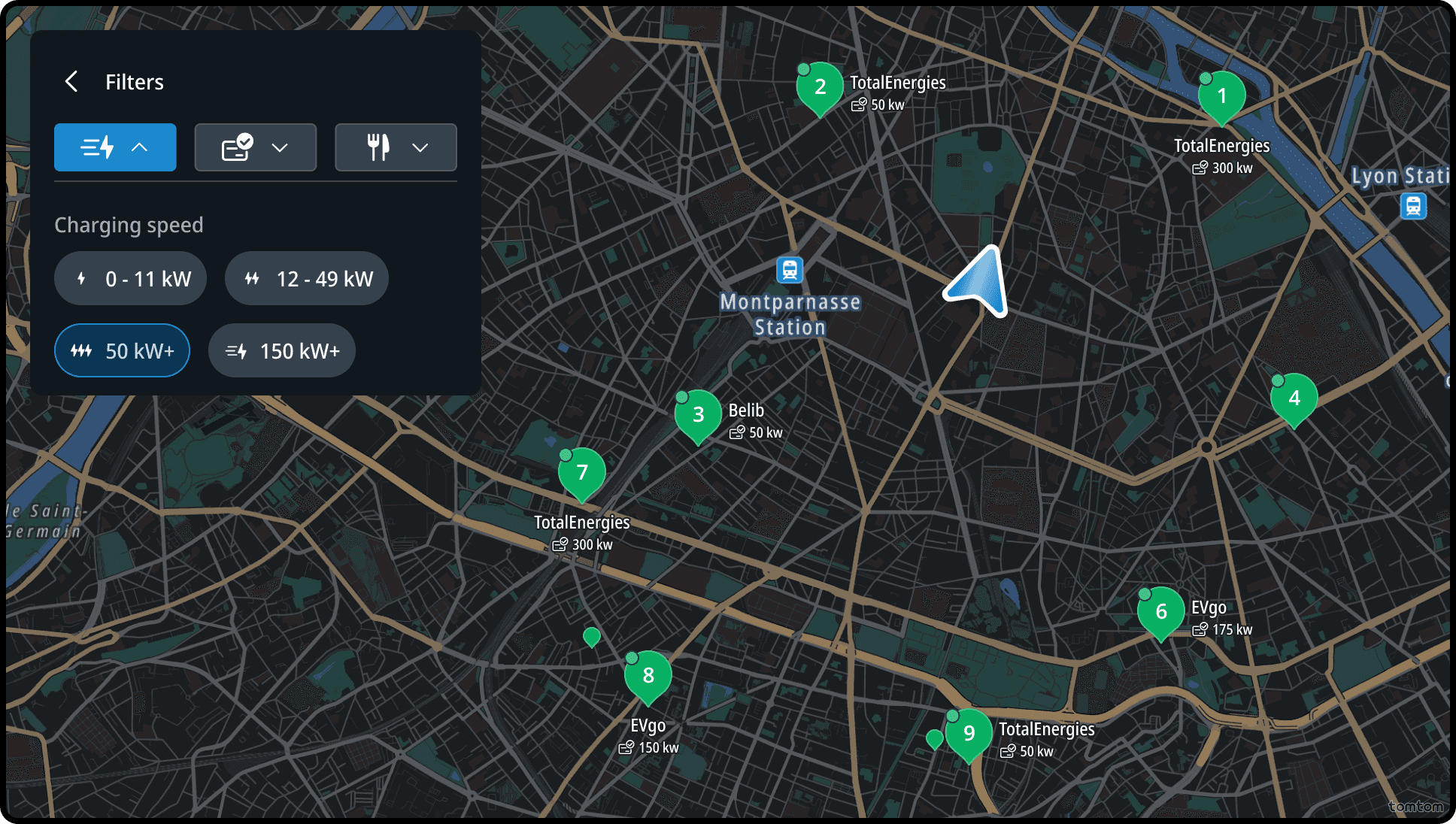 此筛选器在搜索充电站时出现,作为 EV 快速筛选的一部分,允许用户查看具有特定充电速度的充电站。用户可以从以下选项中选择: