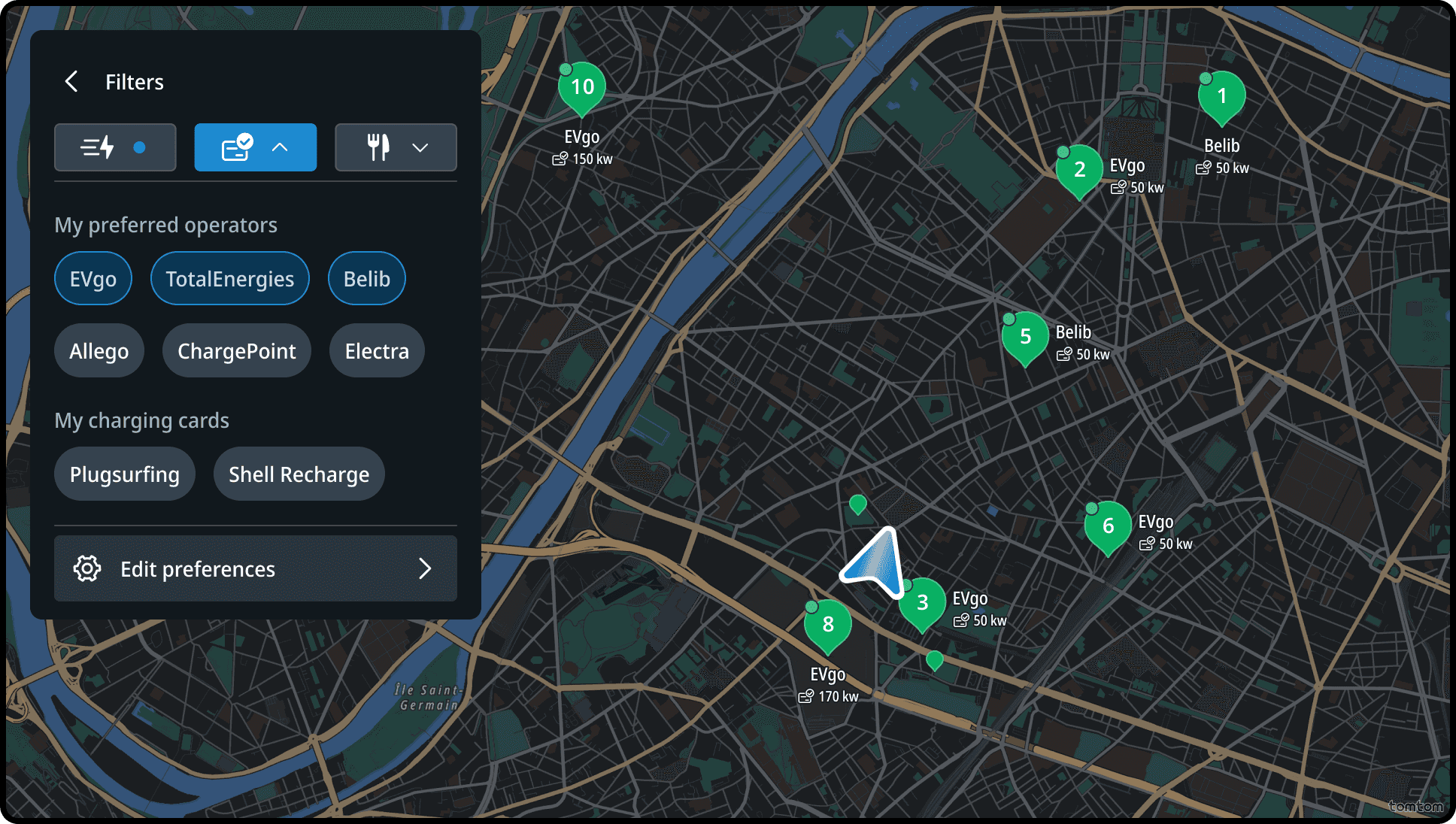同样,点击支付快速筛选按钮允许用户修改充电卡和运营商偏好筛选。