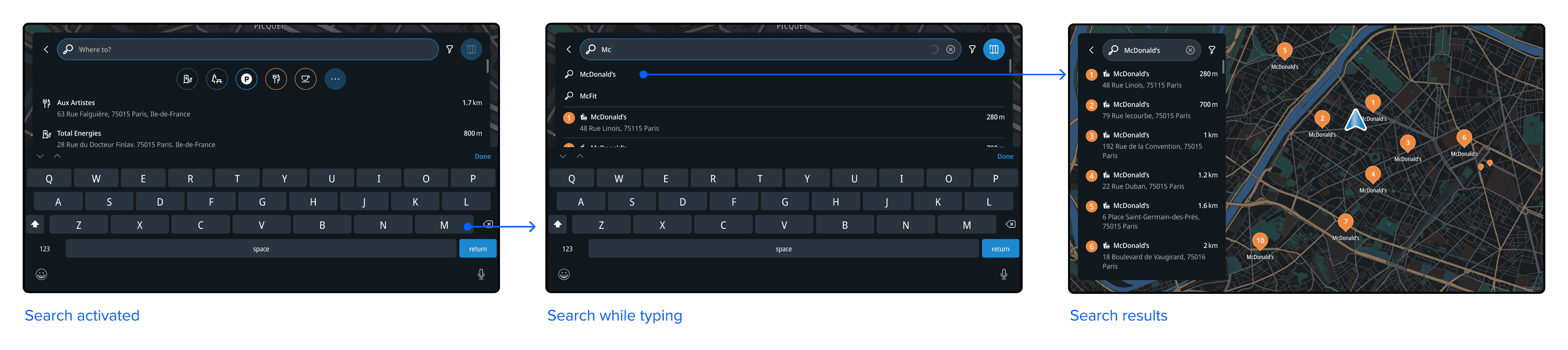 当用户激活搜索时,键盘出现,且额外的 POI 类别会与最近位置一起显示。