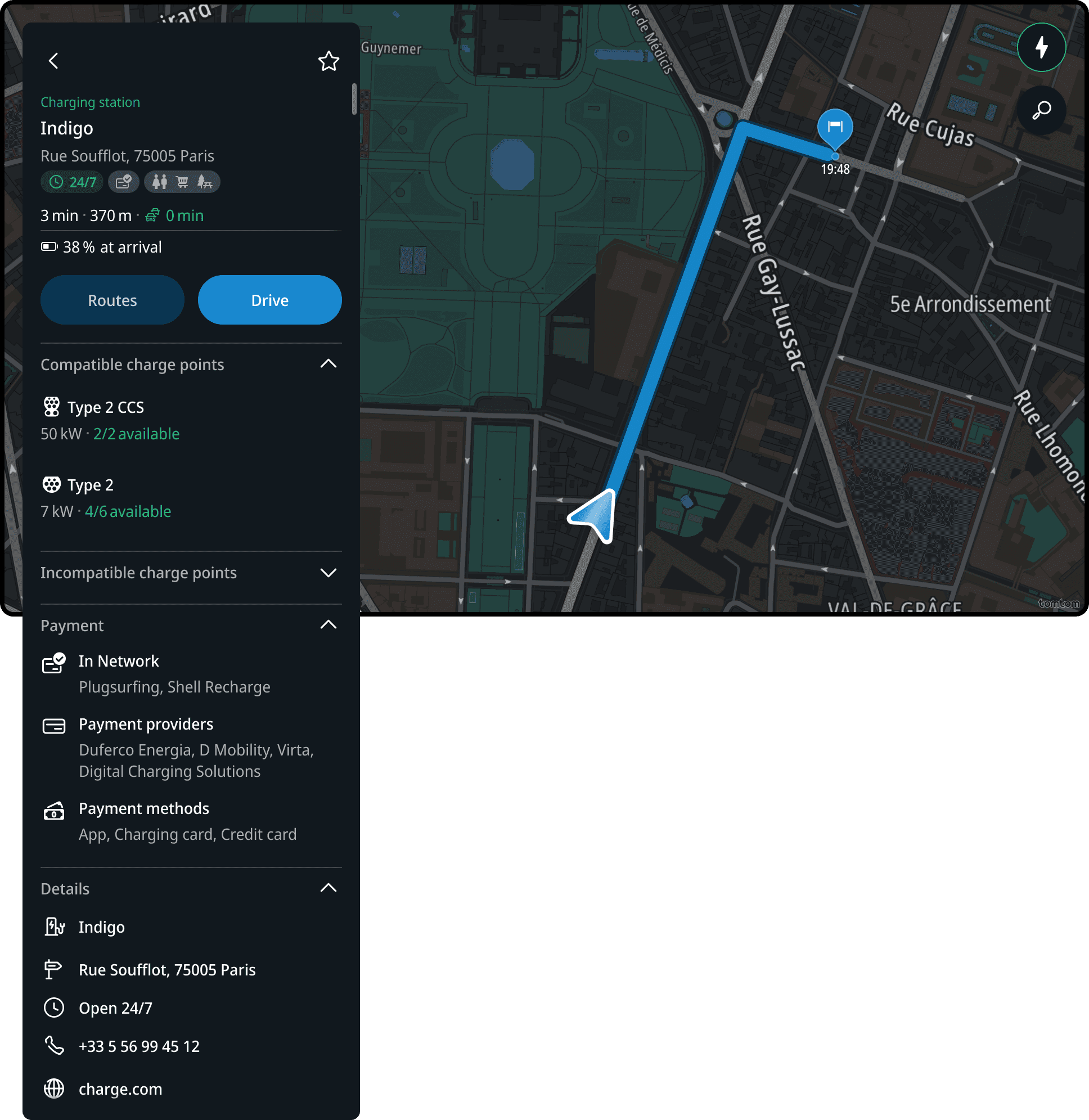 例如,充电站将显示可用性、兼容插头类型、接受的支付方式和营业时间。