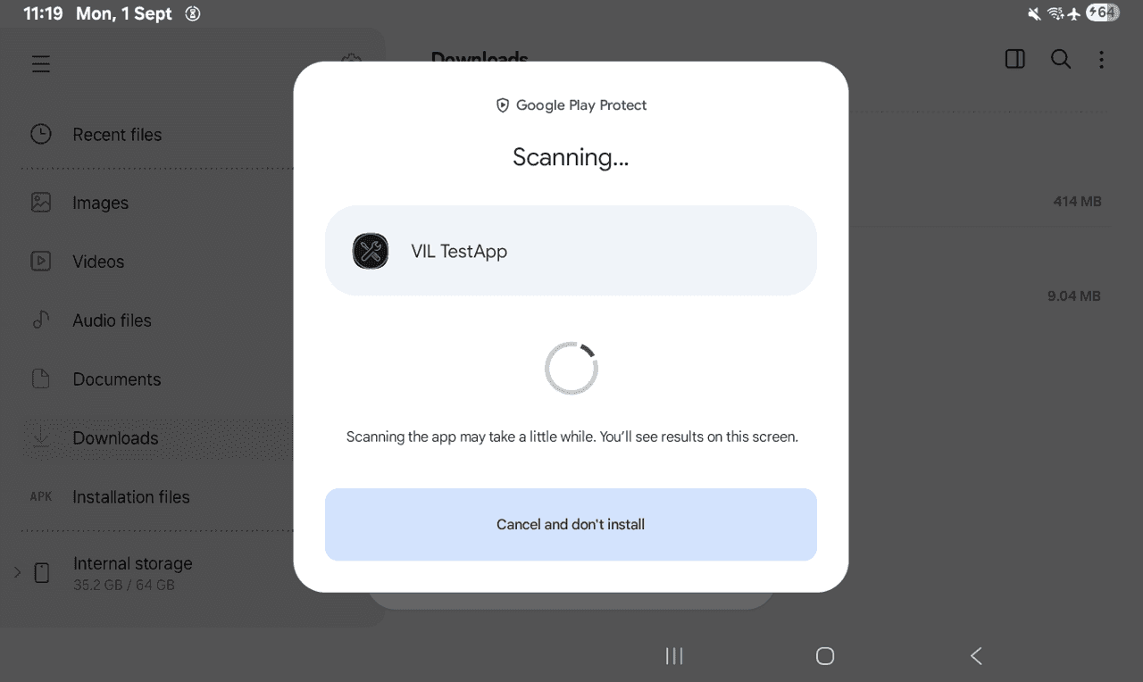 如果您已经配置好 adb 并且平板已连接,您可以直接从电脑安装 APK,跳过下面的传输和设备端安装步骤:adb install <path-to-ANA.apk>adb install <path-to-VIL.apk>之后,直接跳转到 打开 VIL。
