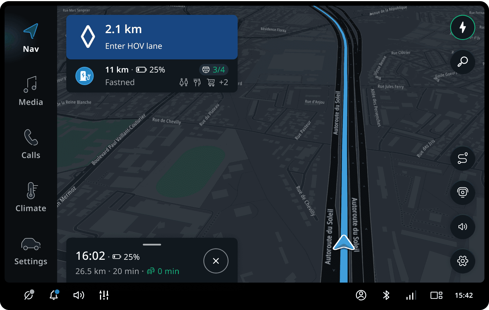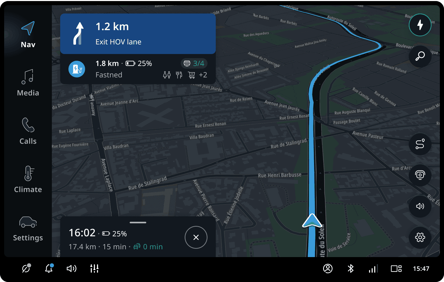 When the route goes through a highway, the guidance provides information of High Occupancy Vehicle (HOV) lanes -- also known as carpool lanes or diamond lanes. This visualisation includes the entry and exit point of the lanes.