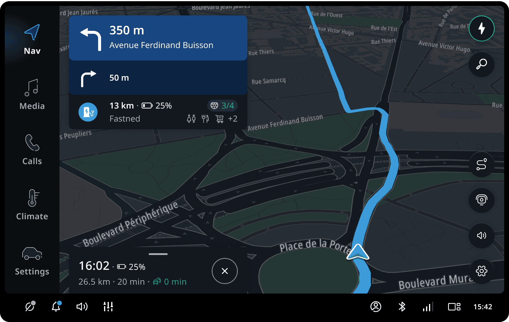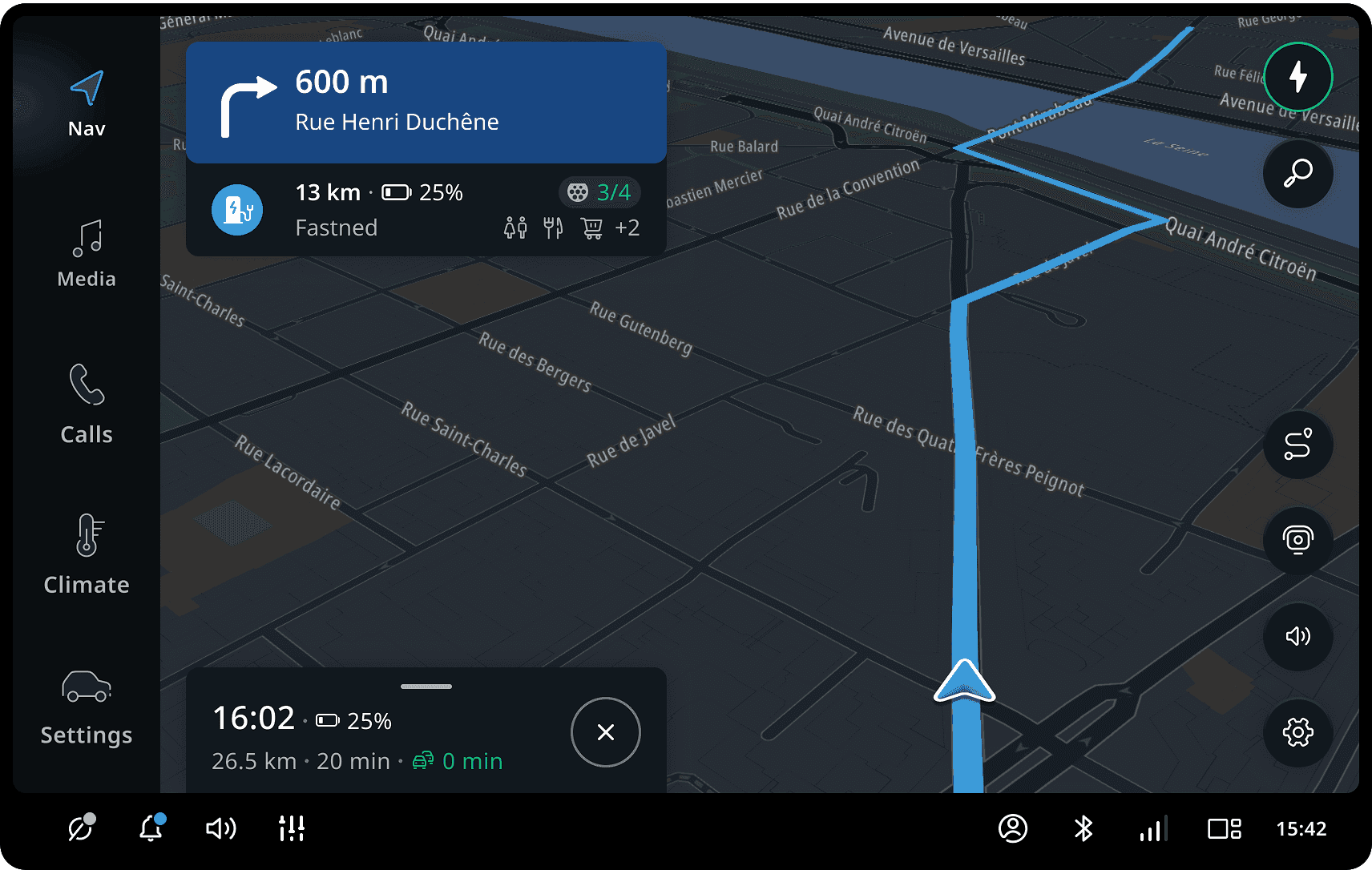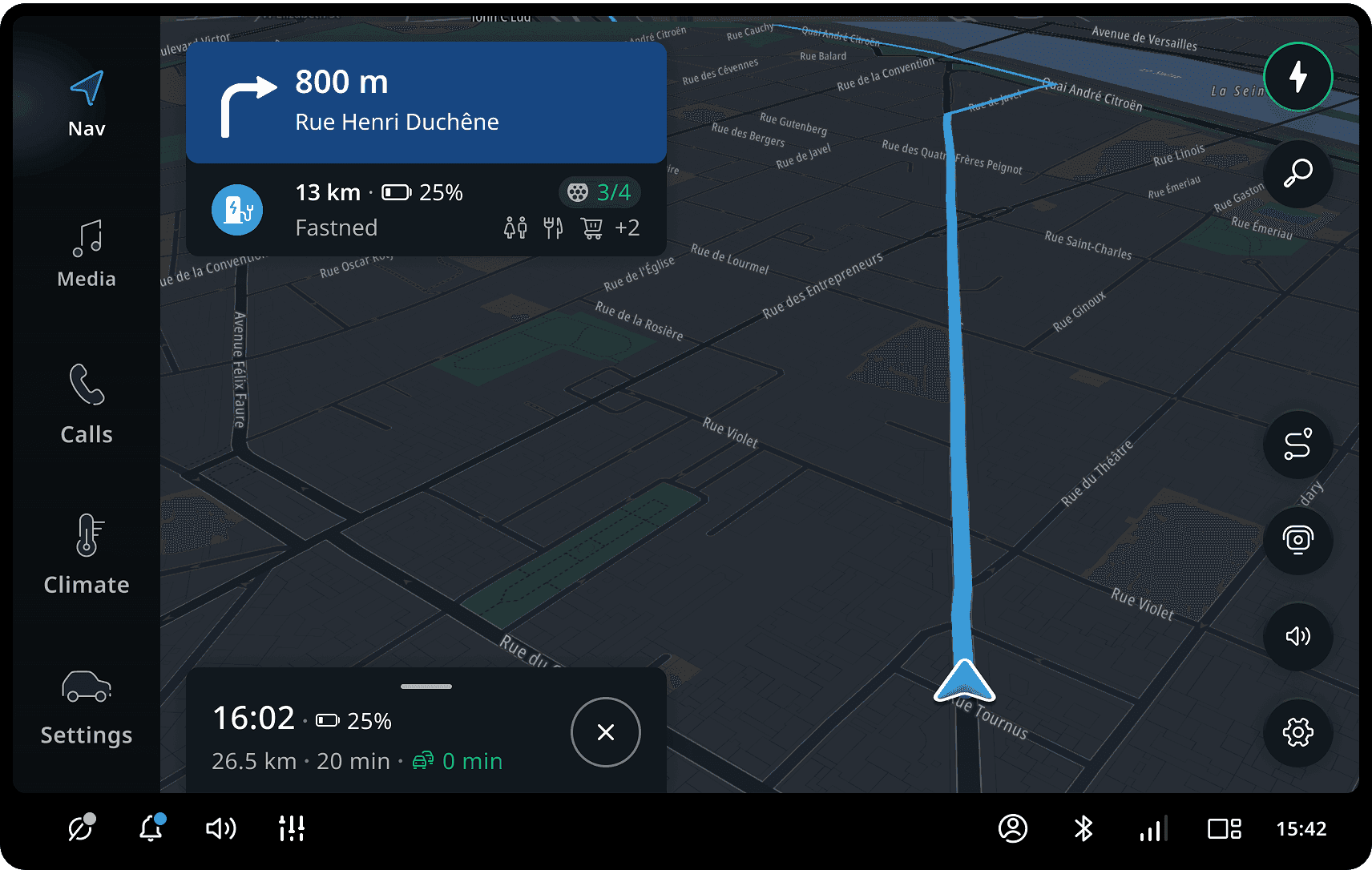The Guidance view provides users detailed guidance instructions (both visually and verbally) together with visualized route paths on the map. The map view automatically adjusts to show the most optimal route and next maneuver view.