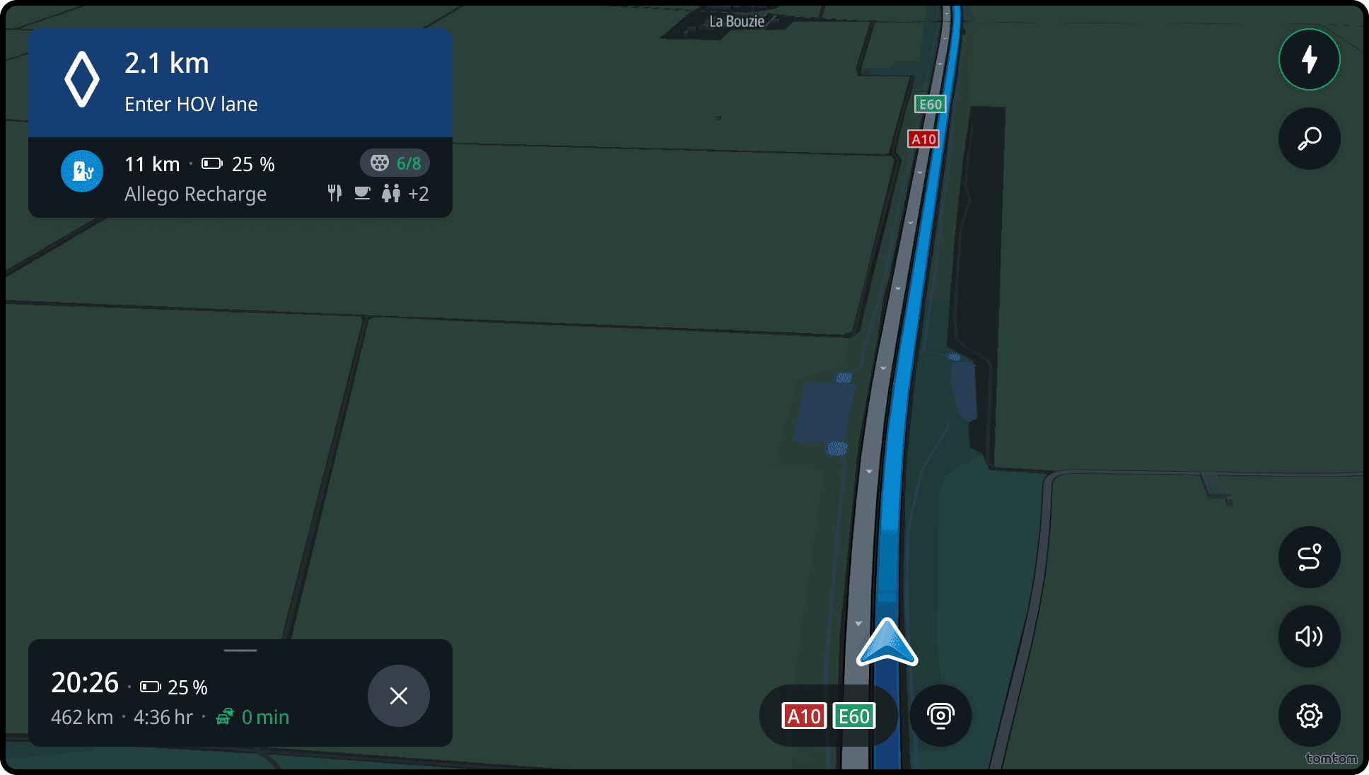 If the road at the maneuver point has multiple lanes and the position of the car may impact the maneuver, the guidance provides a lane visualization. This visualization highlights the lanes the driver needs to take to complete the upcoming maneuver.