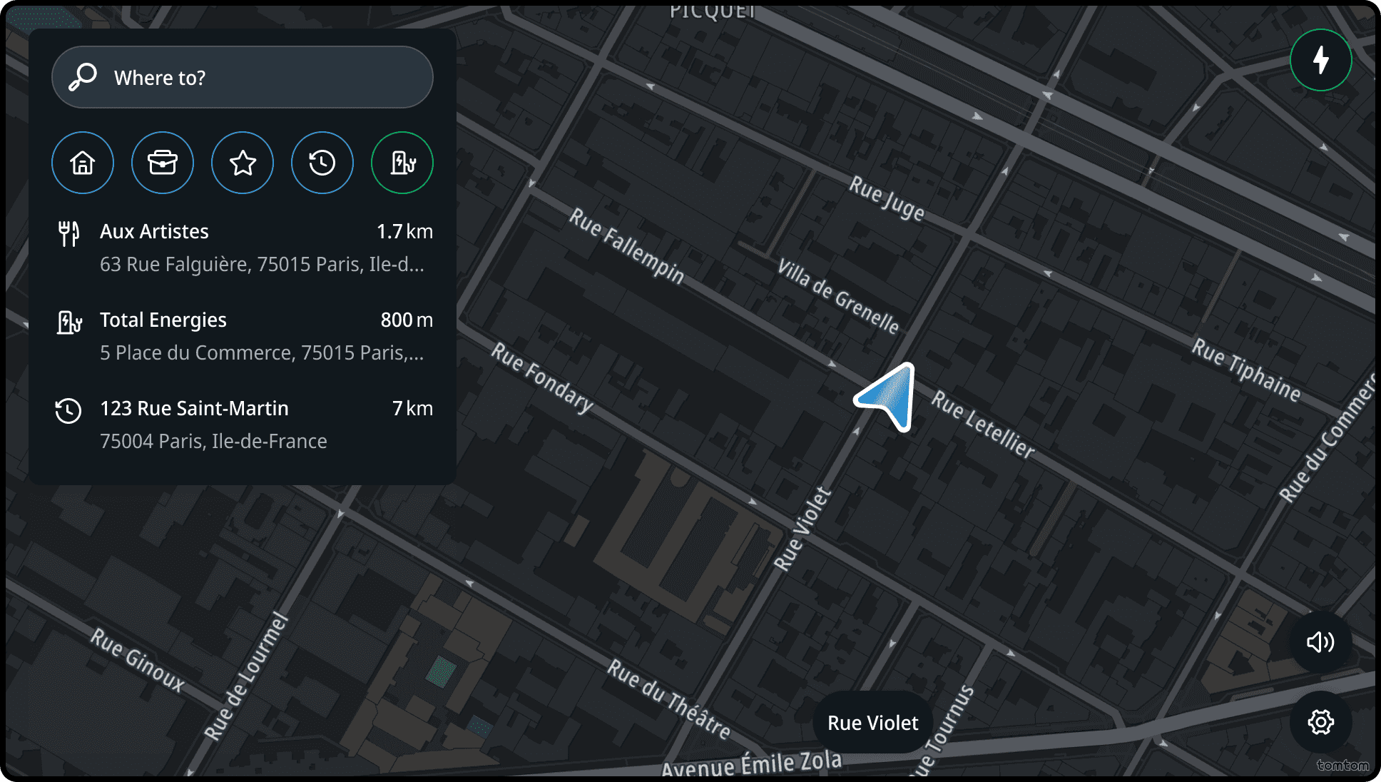 POI category: tapping this starts a search by category, based on priority and vehicle type. For EVs, that's charging stations, for ICE and PHEV cars that's gas stations.