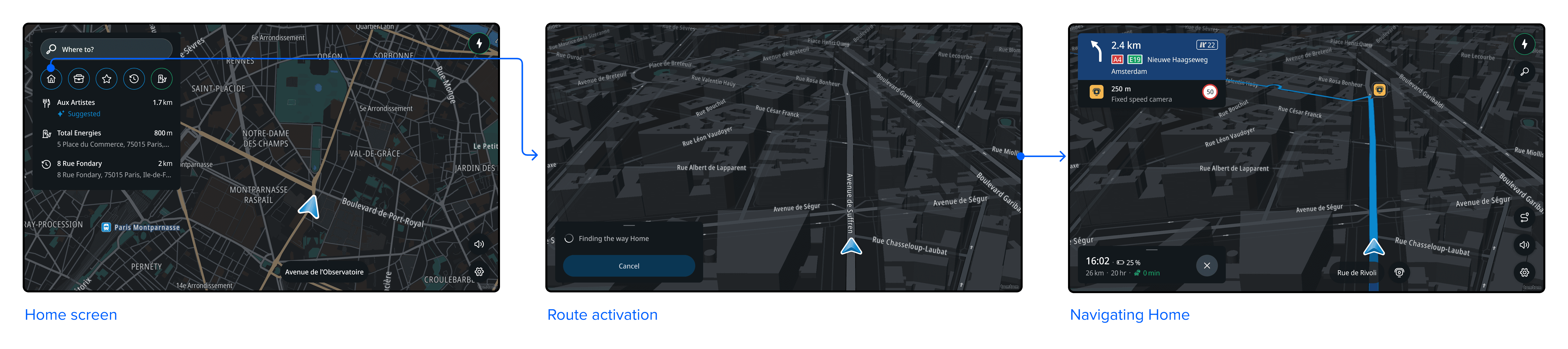 Next to the text search, the destination entry panel contains shortcuts to Home, Work, favorites, recents and a search for a common POI category. If user has already set their Home or Work addresses, tapping these elements would lead straight to guidance.