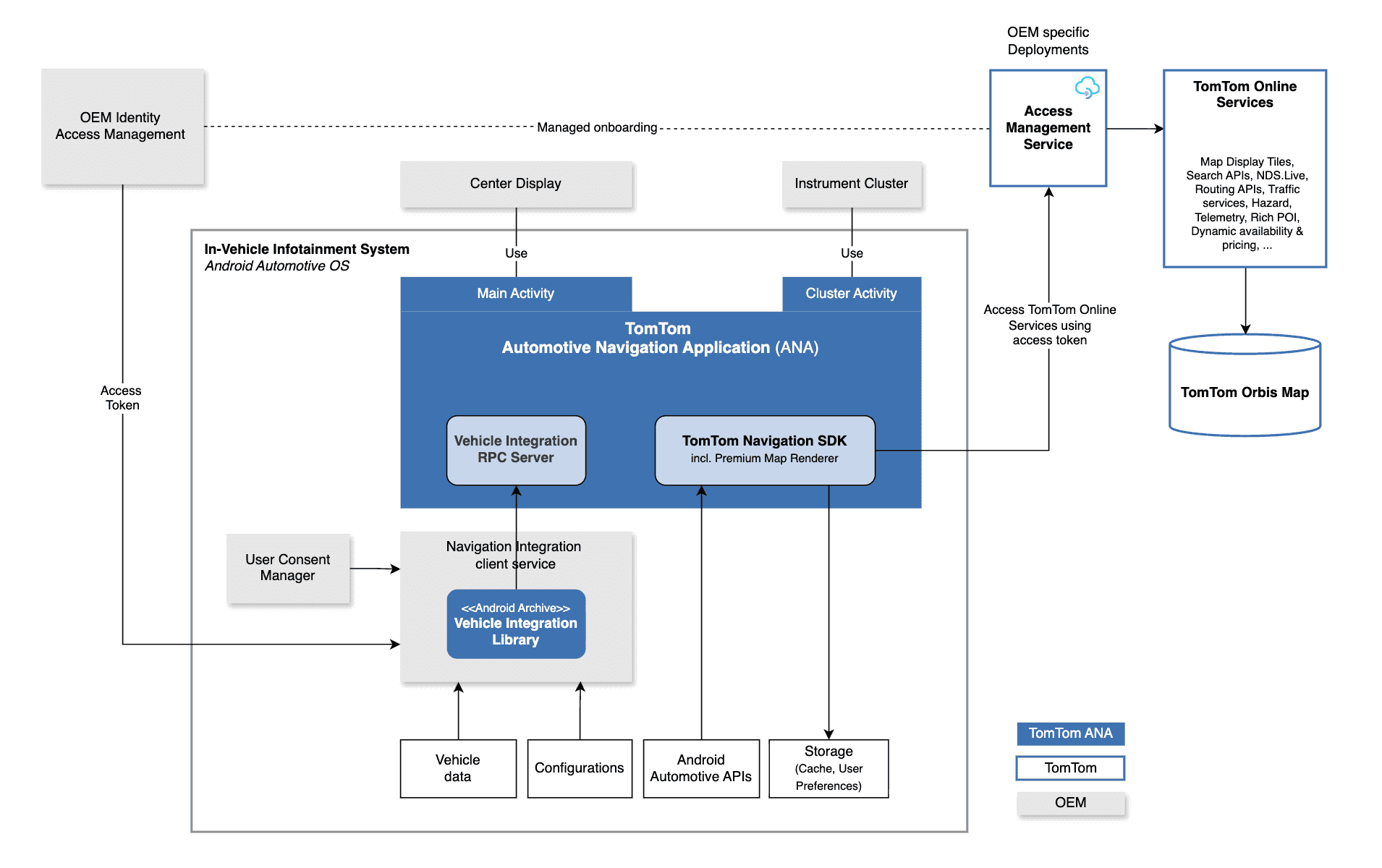 - Online services and access management. TomTom Online Services are hosted in a TomTom-managed cloud environment. Access from ANA to these APIs is controlled by an Access Management Service, which requires integration with the automaker’s Identity Access Management (IAM) system for identity management, authentication, and authorization. Access tokens, issued by an automaker’s IAM system, should be provided to the Vehicle Integration Library.