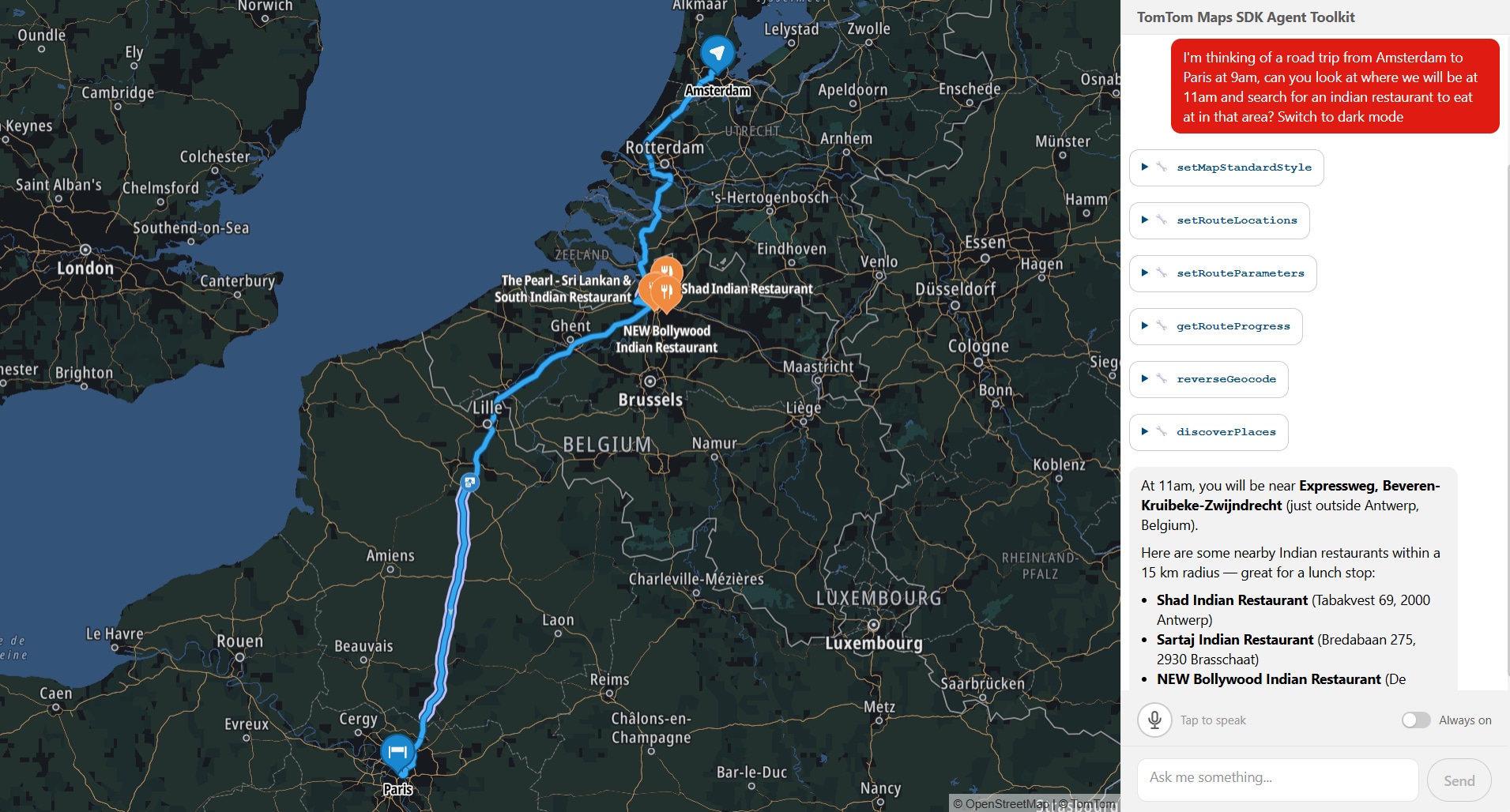 Meet our Agent Toolkit, delivered as a plugin for our Maps SDK: @tomtom-org/maps-sdk-plugin-agent-toolkit. It brings conversational AI to your map: an agent layer that runs client-side, right alongside your existing SDK setup. Sitting between your chat interface and the TomTom Maps SDK, it handles the full chain from user message to live map update.
