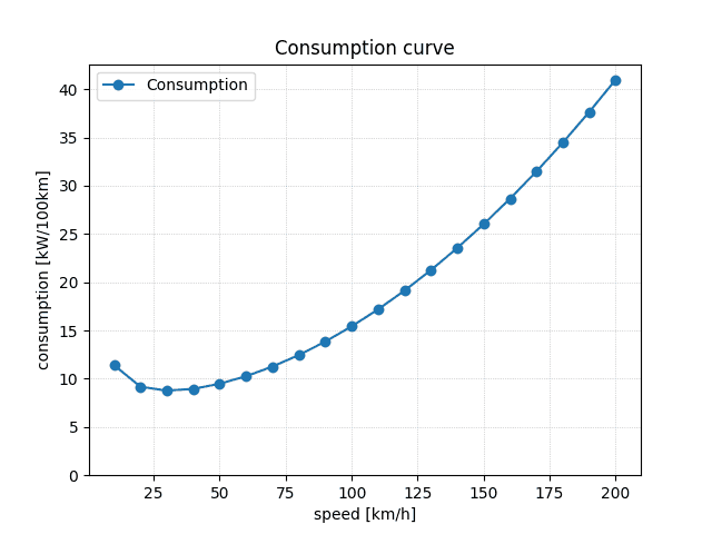 The consumption curve represents the energy required to travel 100 km while overcoming air and rolling resistance at varying speeds under ideal conditions. This parameter is crucial for accurate consumption estimates and must be updated when conditions change that affect rolling resistance (such as weight increases).