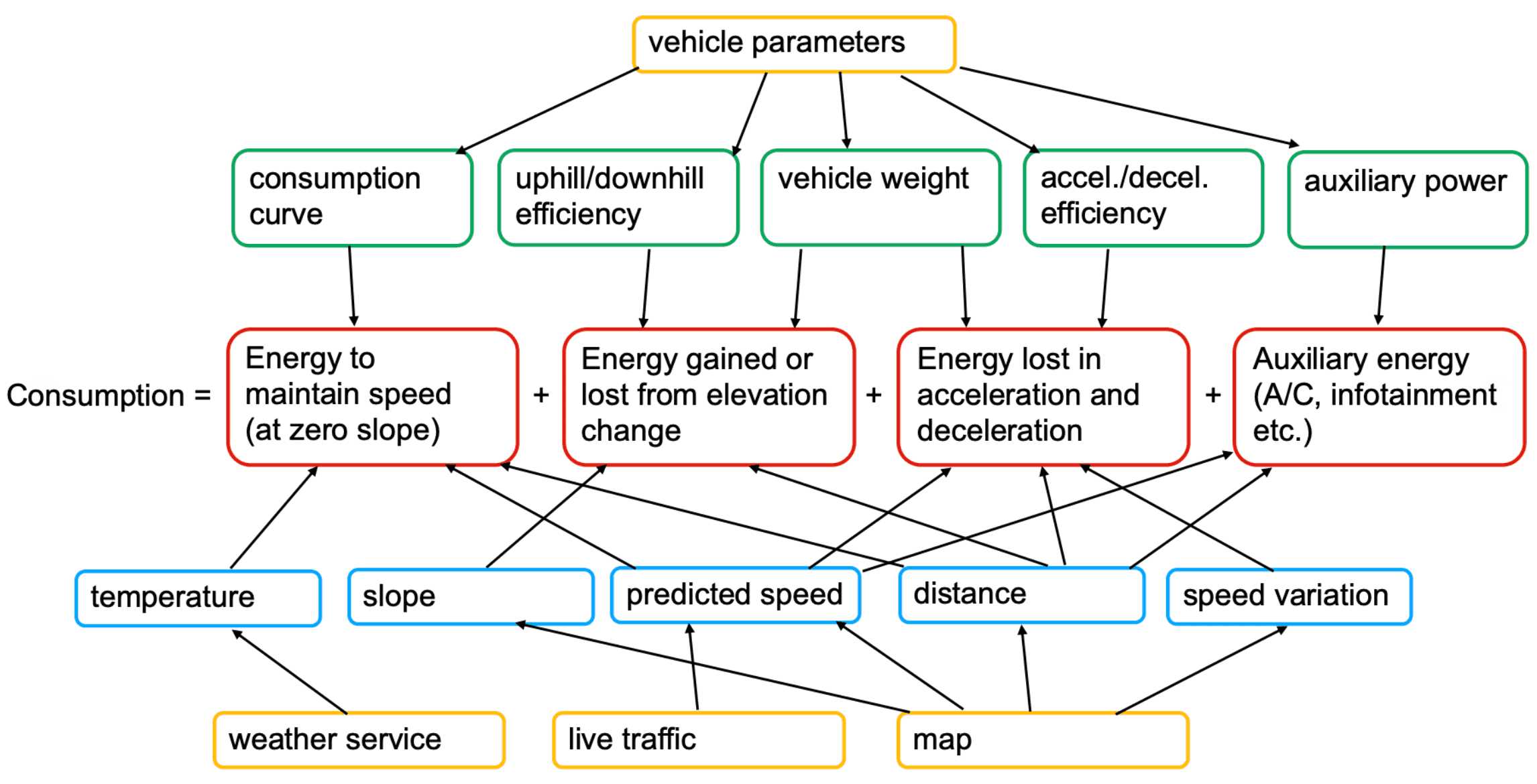 The Navigation System must accurately predict energy consumption along the route to estimate State of Charge (SoC) upon arrival, display range on a map, and automatically incorporate charging stops. Several parameters are essential for reliable consumption estimates. Some parameters serve additional functions; for example, vehicle weight is also used to avoid roads with weight restrictions during routing.