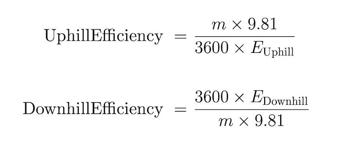 Uphill and downhill efficiency values are independent of current vehicle weight and do not require updates when weight changes. Their relationship to energy consumed per kilometer of elevation gain (EUphill) and energy recovered per kilometer of elevation loss (EDownhill):