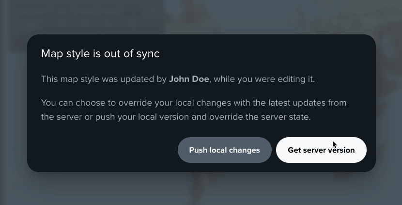 When you still end up in the situation, when the same style is edited by multiple users, when trying to save your changes, Map Maker will inform you about the conflict. From there you can choose to either override the changes made by others or discard your changes and reload the latest version of the style.