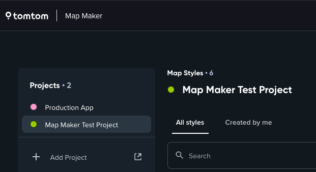 When you are assigned to a project, after opening the Style List page in Map Maker, you will see the Project list on the left sidebar. This list contains all the projects you are a member of. To switch between the projects, just click on the project name.