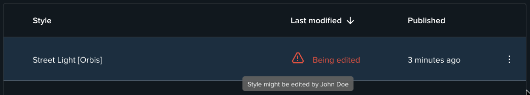 To avoid situations where multiple users edit the same style, Map Maker will show you an indicator if the style was edited in the last 5 minutes by another user. If you see this indicator, it is recommended to coordinate with your team members to avoid overwriting each others changes.