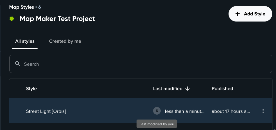 To help you navigate between styles, you can use All styles and Created by me tabs above the style list. This will filter the styles based on the style creator. Hovering over avatar in the Last modified column of the style list will show you information about the user, who last modified the style.