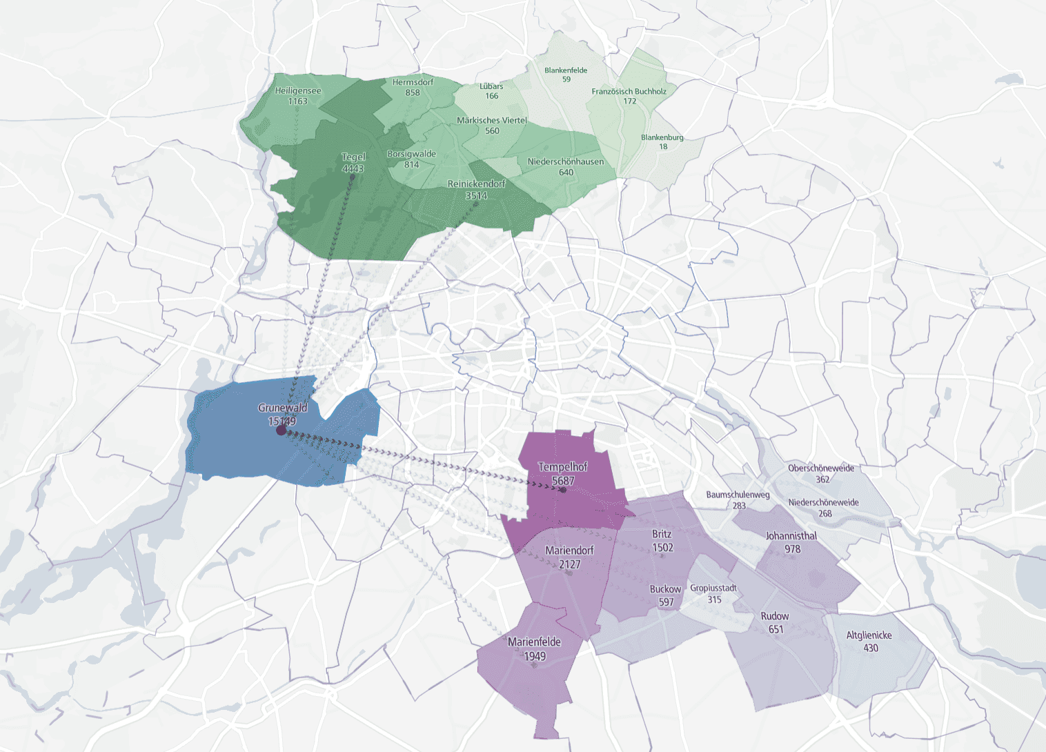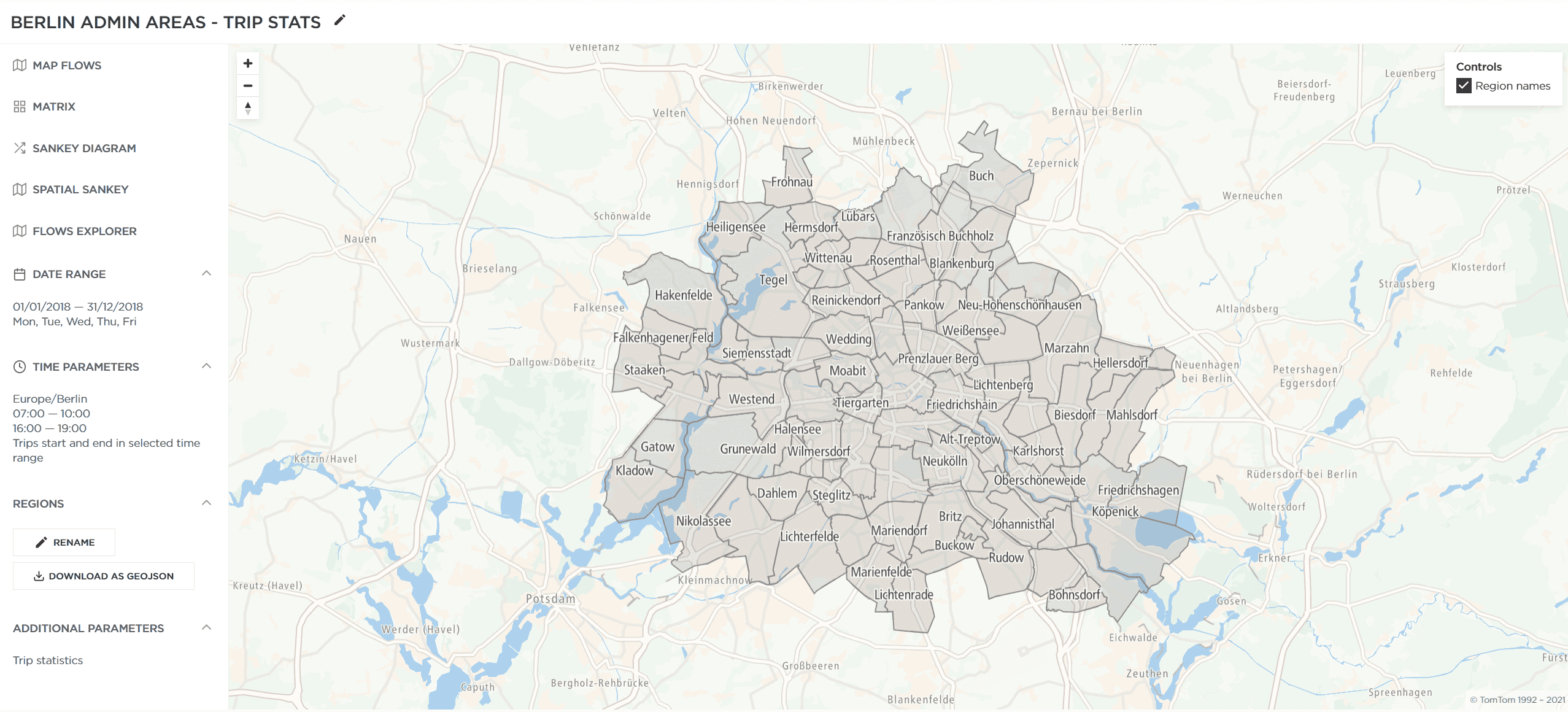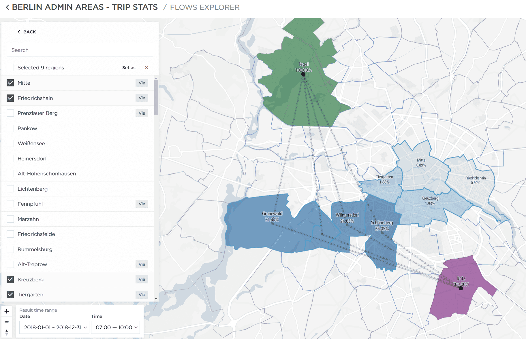 To select multiple regions it is possible to use the region list on the left or hold the CTRL key and click on the regions on the map. Thanks to that you can see the start and the end regions, and multiple via regions where the trips travelled through and their trip percentage value.