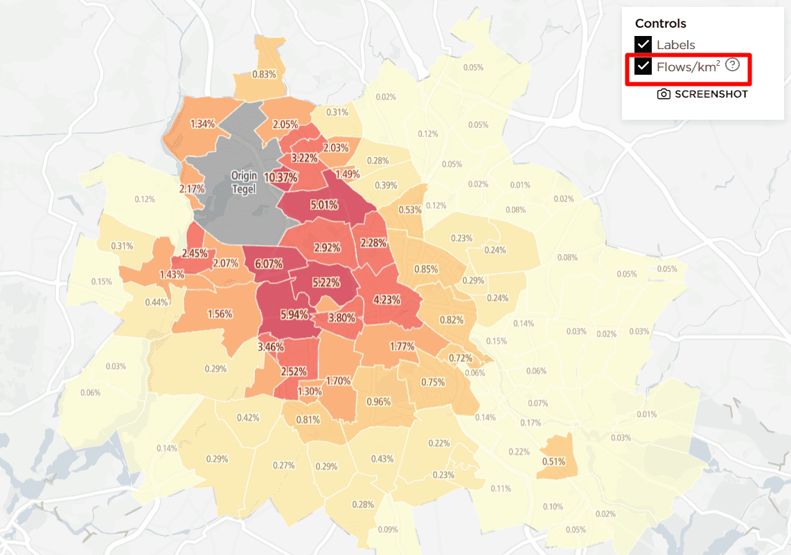 Just like Map Flows, this view also allows you to check the Flows per km2 values in the upper right corner:
