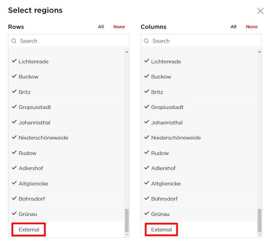 The additional region that is not selected by default is External. Checking this region shows you the number of trips coming from the area outside the selected regions and vice versa, from your regions to outside.