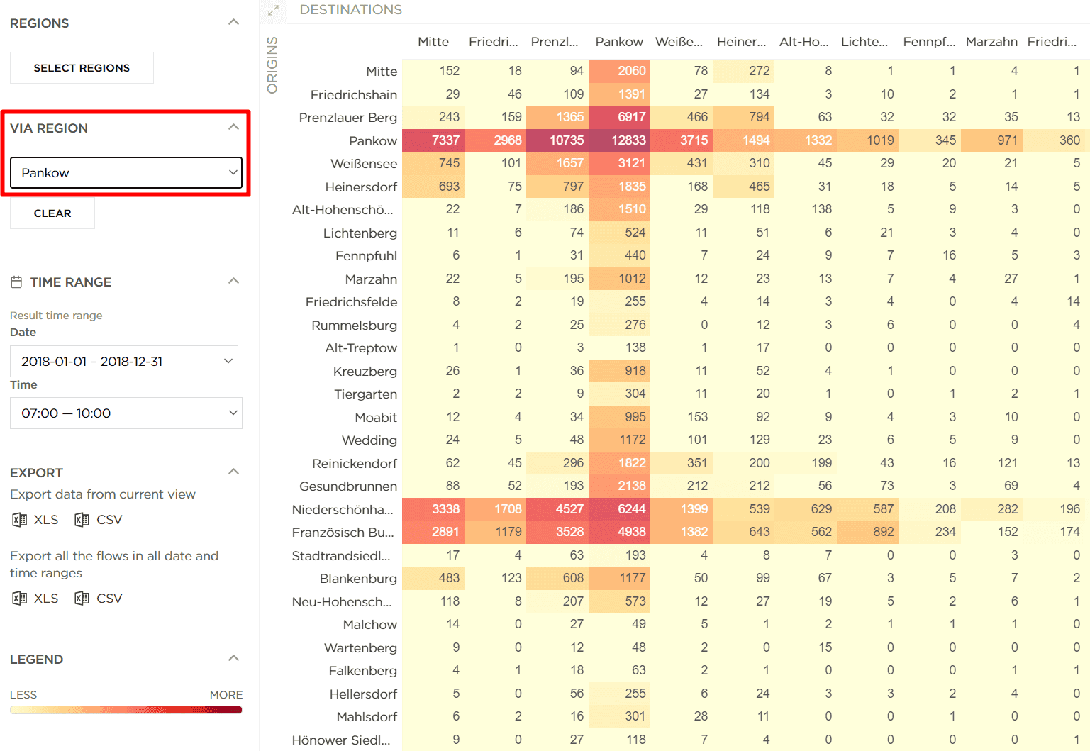 Another option available in the Matrix view is to select the Via region, which means you will see the number of trips between different regions that specifically travelled through the region selected as Via.