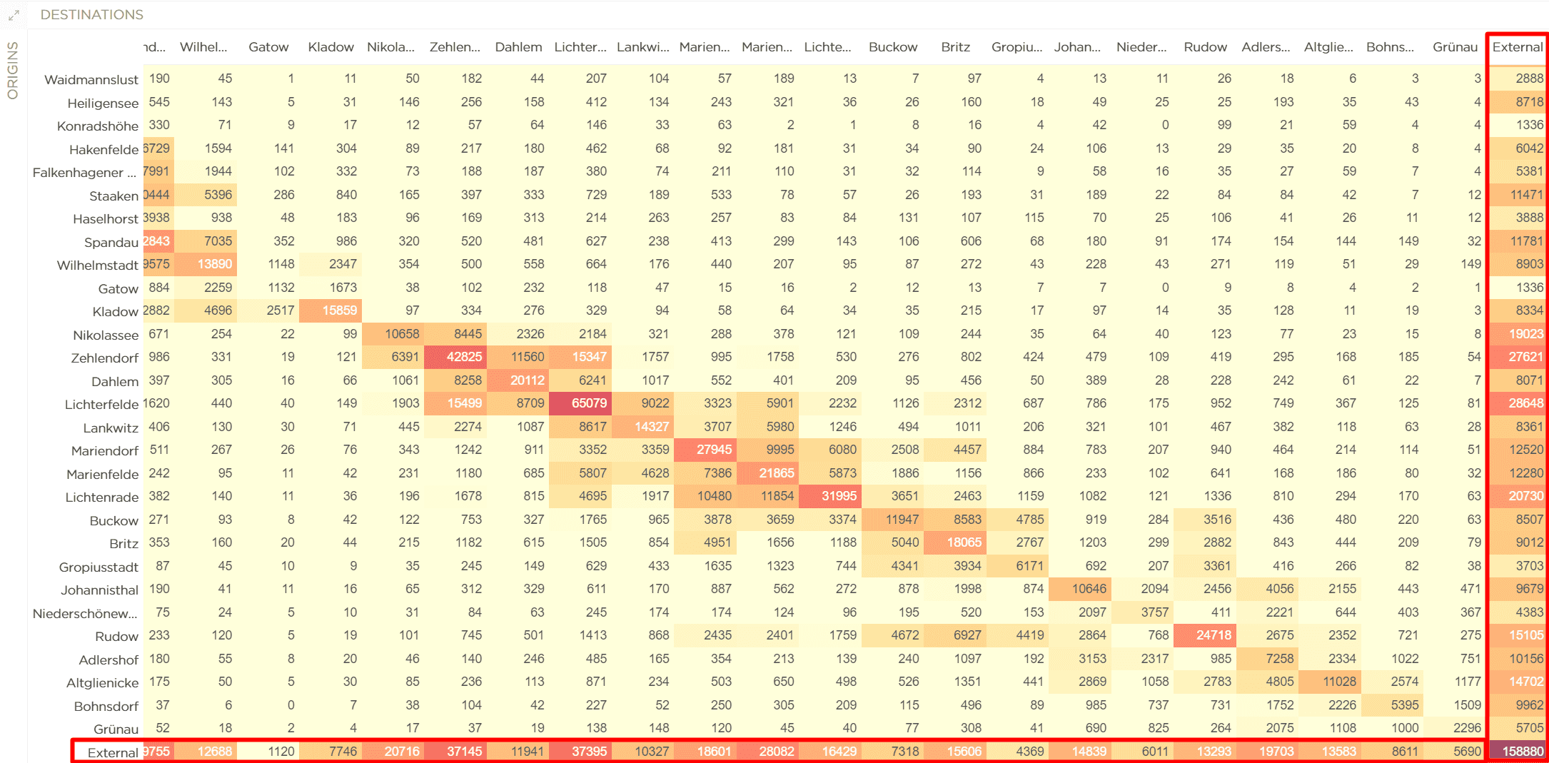 Colored Matrix showing all the relations between regions in form of raw trips data.