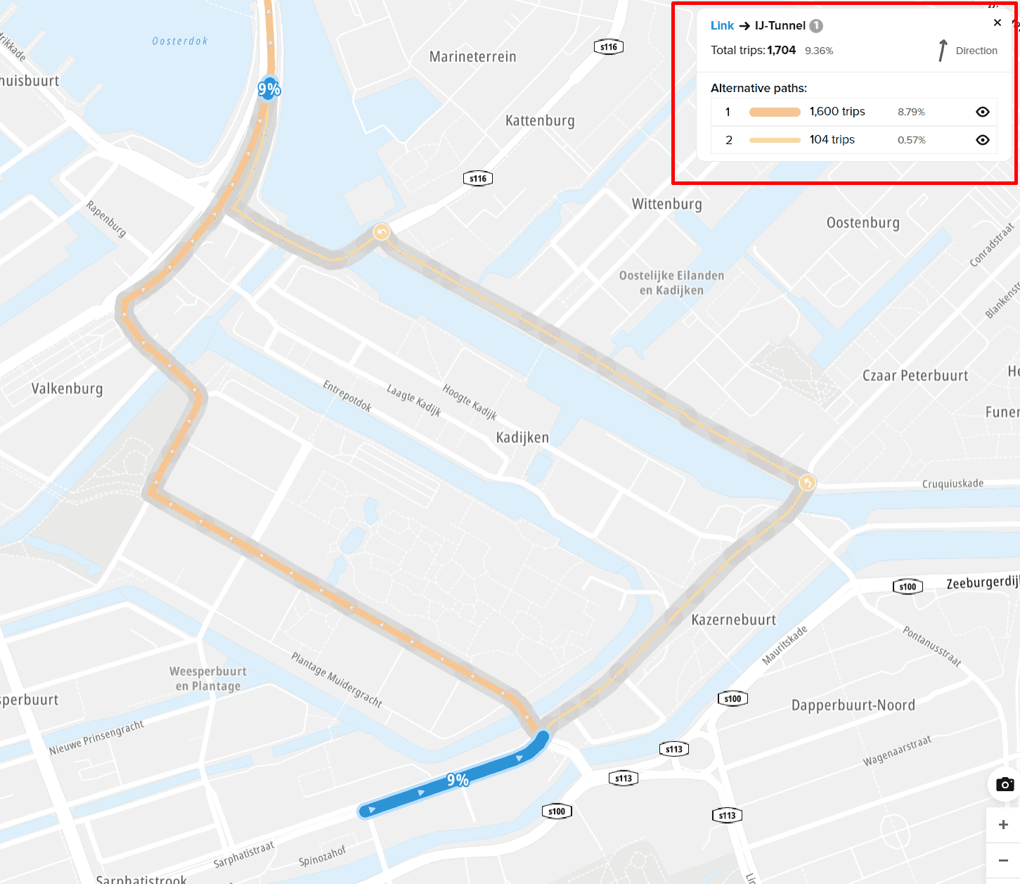 In the results, the segment needs to have at least 0.1% of all the trips coming from the original link or at least 5 trips in case the value is lower than 0.1%. Otherwise, road segments that have less than 5 trips on them will not be included in the results.
