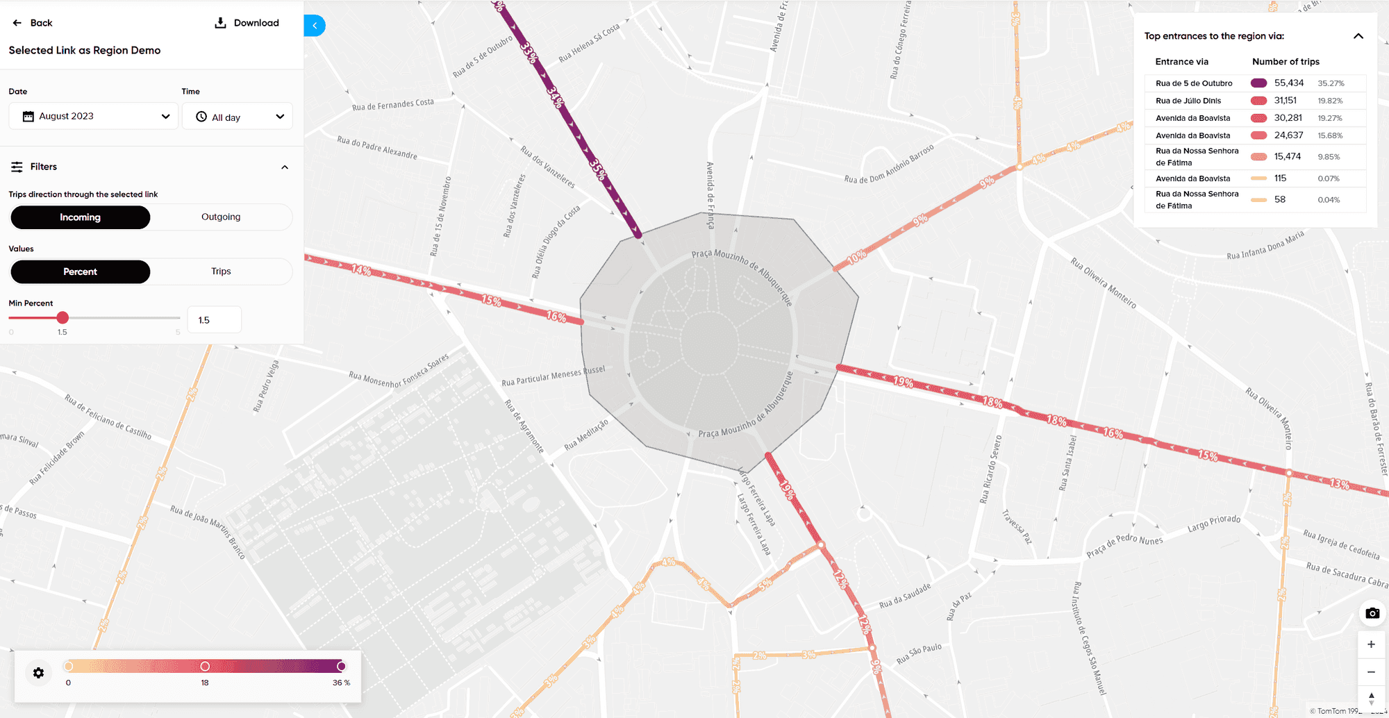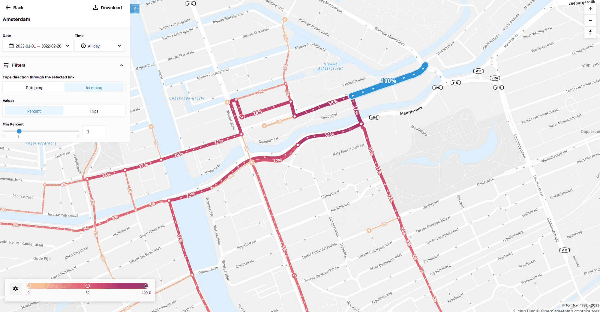 The second one is Incoming trips which shows the trips distribution that ends at the road segment specified by the user during the analysis creation process.
