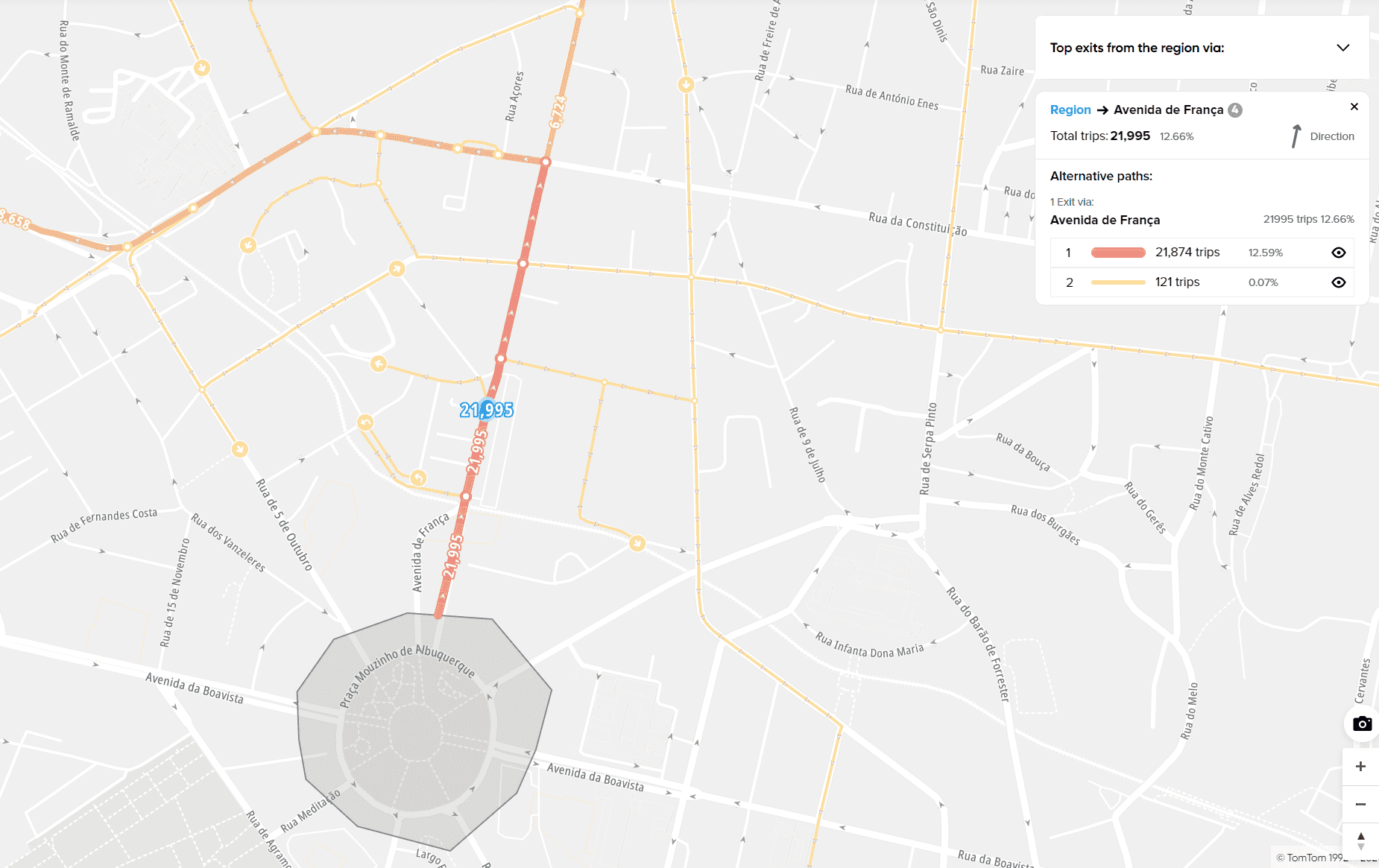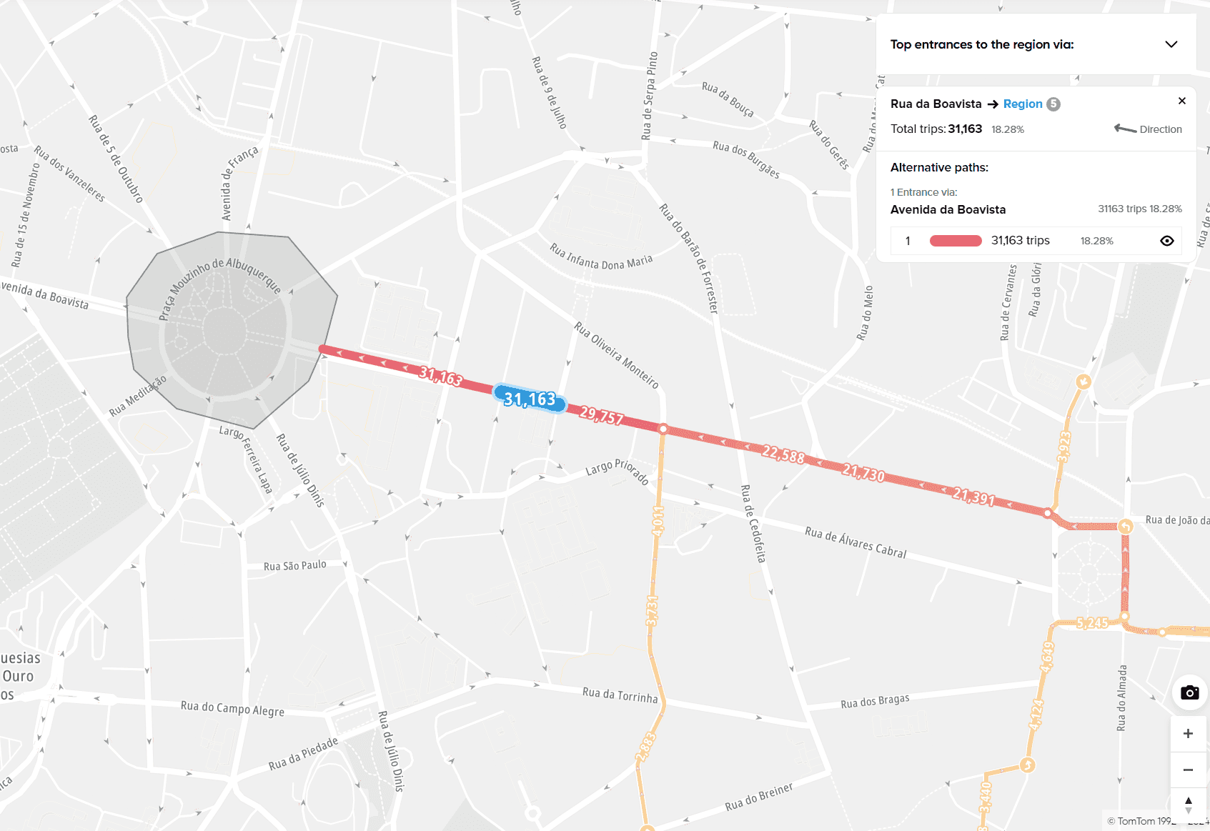 When a road segment is selected, the results will display the path of all the trips observed in that location and traveling to our region. Additionally, it will provide information about all preceding trip paths and their points of origin: