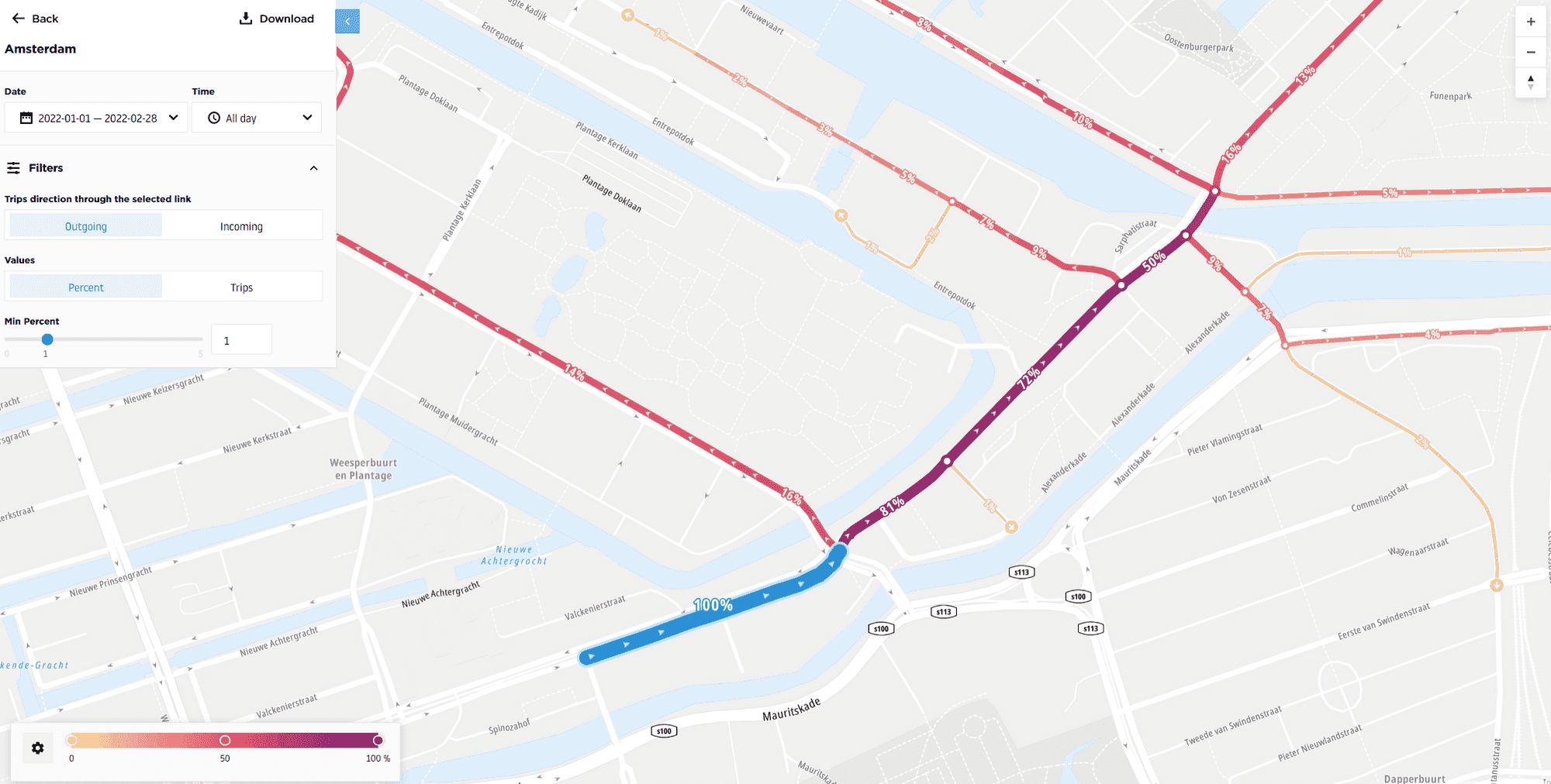 Selecting each road segment is showing how many trips coming from the original link were also observed in that specific segment.