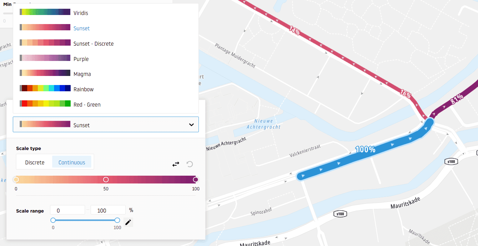 Trips are visualized as different routes coloured based on the customizable scale which can be changed by selecting one of the predefined colour templates.