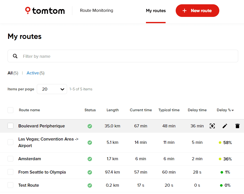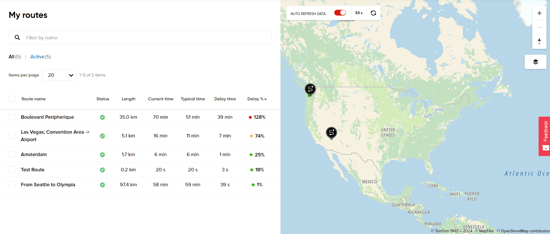 The Refresh button allows updating the results of the created routes. It is also possible to select the option to automatically update the routes every 60 seconds. This setting can be found in the upper left-hand corner of the map view.