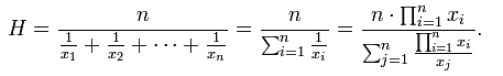 The harmonic mean is appropriate for situations when the average of rates is needed. The harmonic mean H of the positive real numbers x1, x2, ..., xn > 0 is defined as follows: