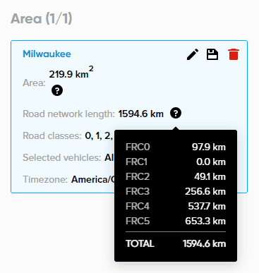 When creating an Area-full or Area-density analysis, the road network length will be calculated by totaling the length of each FRC and then adding those lengths together.