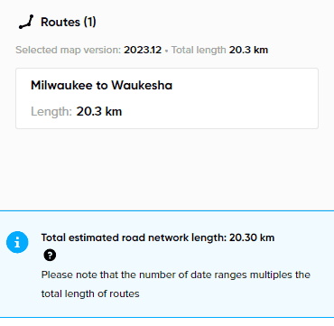 For example, if a 20 km route is analyzed over 5 date ranges, your verified road network length will be 100km.