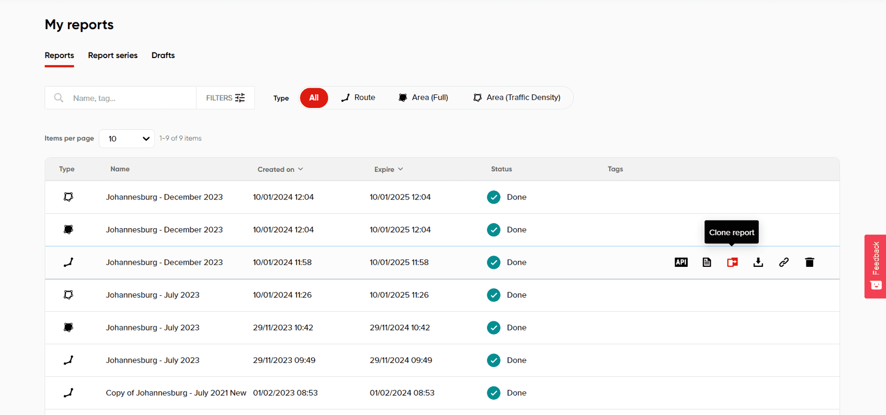 A pop-up menu showing "Clone report" option within "My reports" tab.