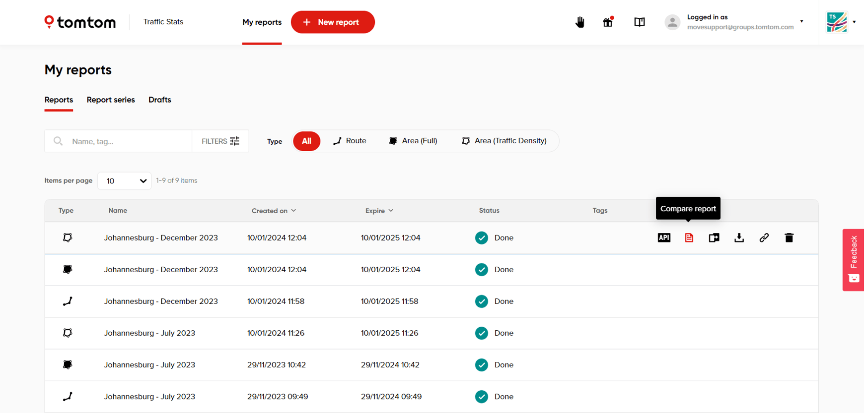 Traffic Stats has a very useful feature - Compare report, which allows comparing two different analyses based on date and time ranges. However, the polygons and map versions within those analyses should be equal.