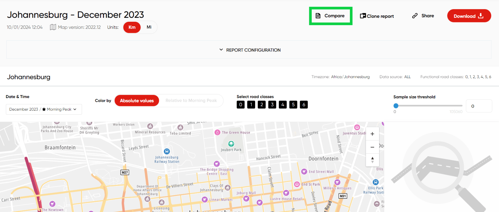 In the comparison view, the user will get the same data for every segment such as direction, sample size, median and average speeds, etc. It is also possible to set the settings in the way the interactive map will be colored and filter out the segments with a low number sample size or with a specific road class.