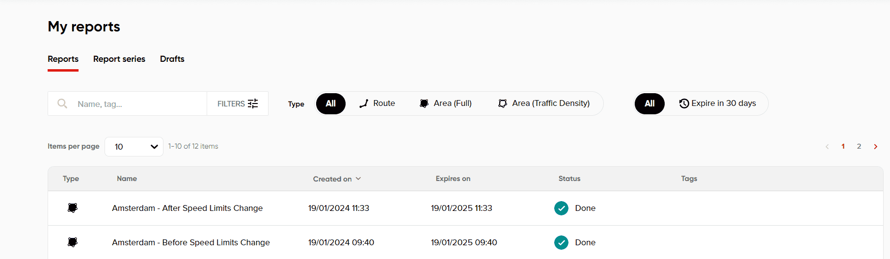 Each user can view his analyses in the My reports section of Traffic Stats. It provides a list of all the previously created reports, along with their names, dates, and statuses. My reports section also has a search engine and an option to filter the results by their type & expiration.