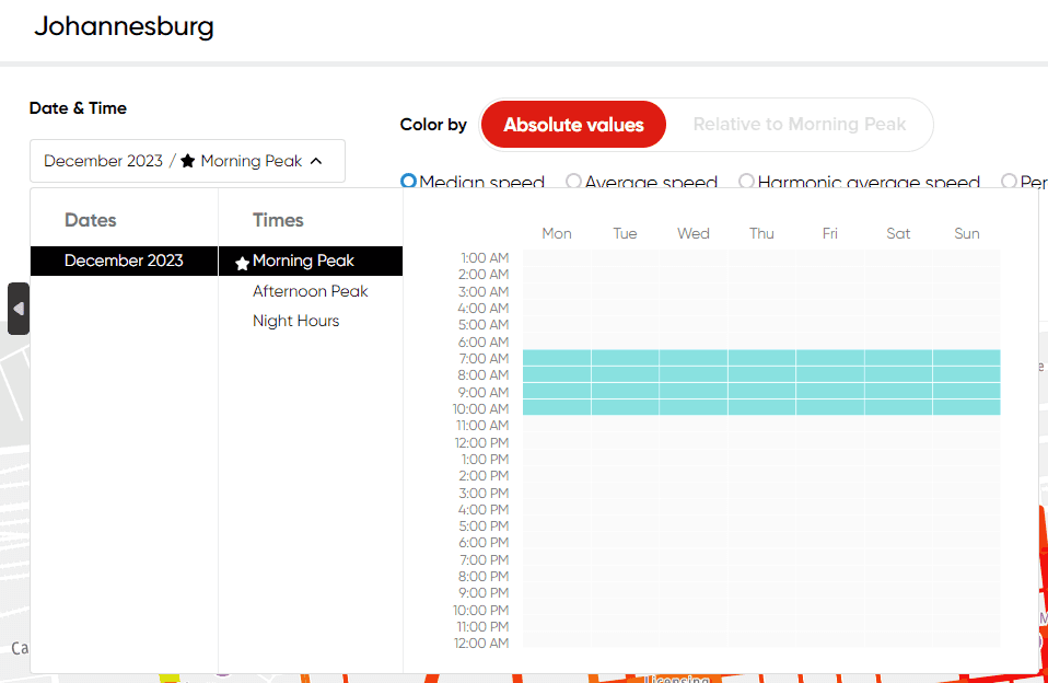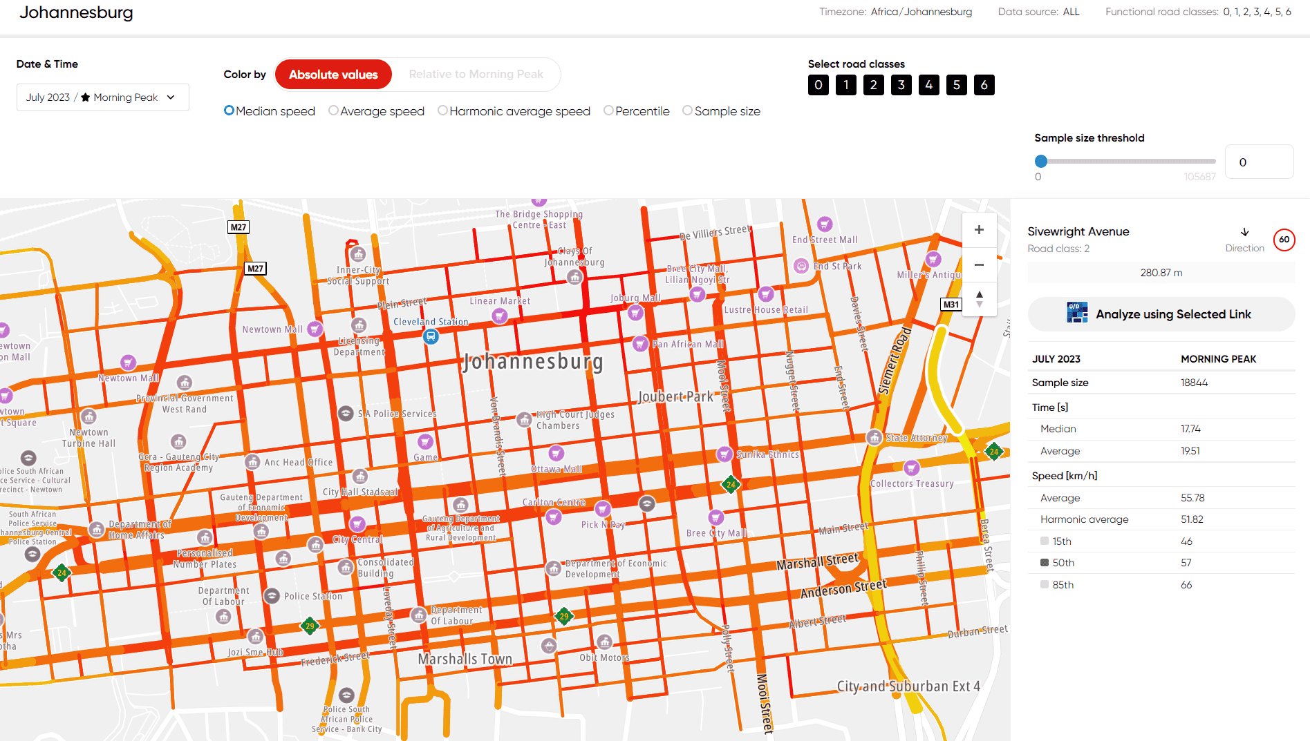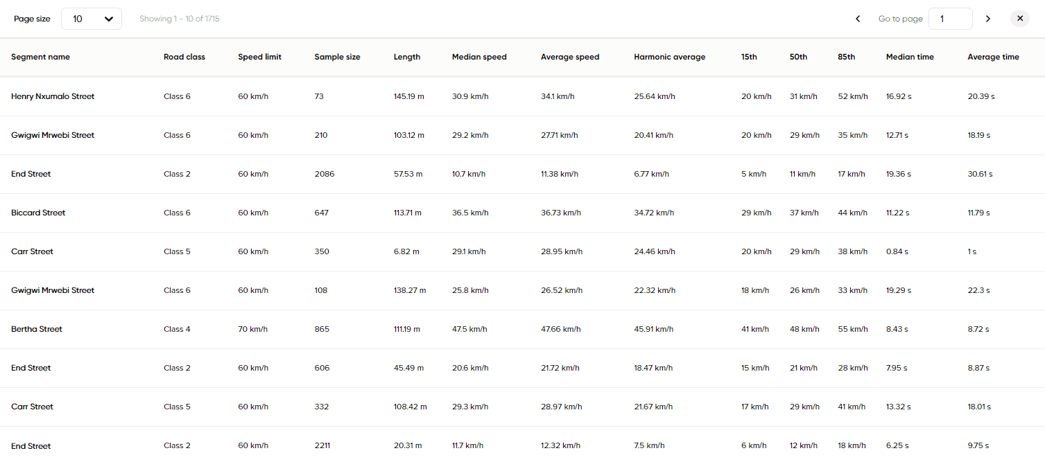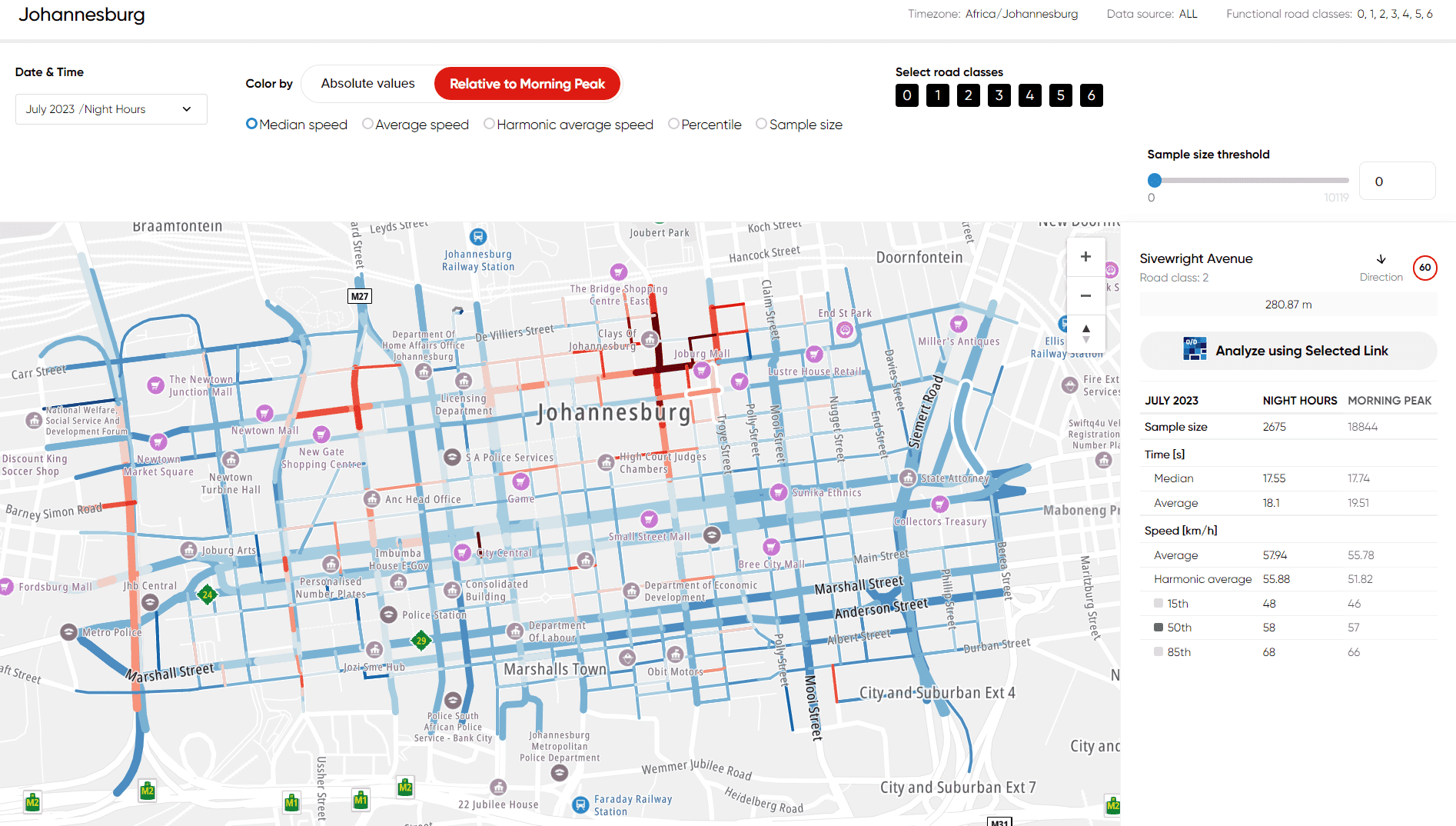 A Shape File with the geometry and DBF files containing the actual speed and travel time data for each road segment is provided. This information is available per the direction of travel. This product is ideal for the support of traffic modeling, strategic decisions, and other more advanced applications that require knowledge of average speeds driven throughout an entire region.