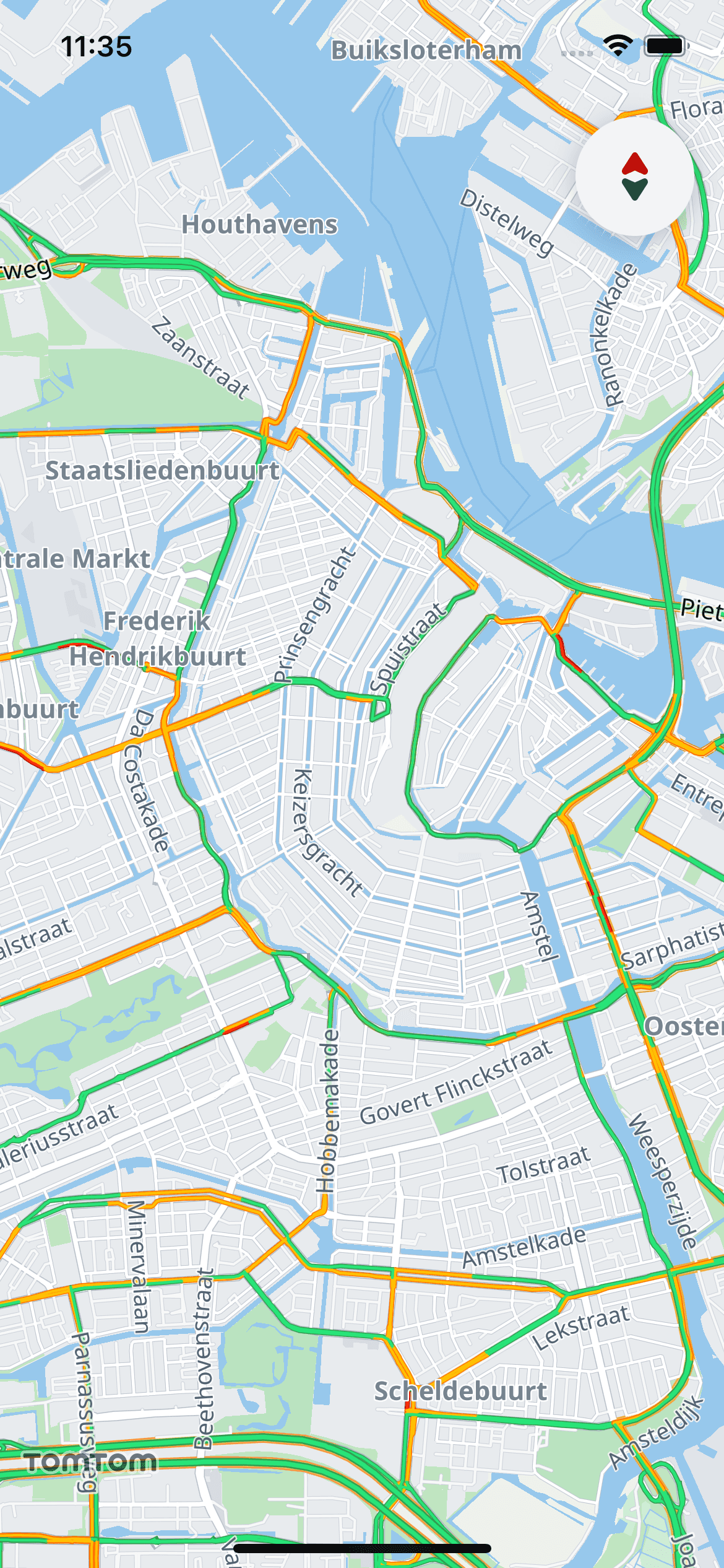 The traffic flow layer shows congestion on the main route network. To show it: