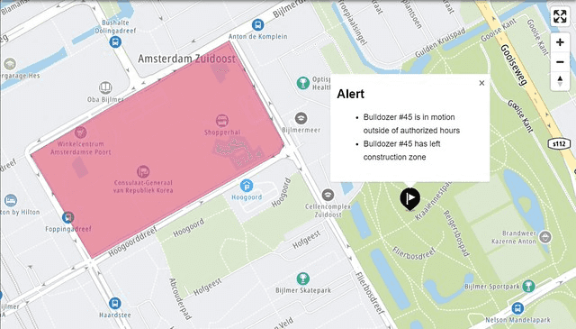 Similarly, you can set up an alert using the TomTom Objects Service and Geofencing API for drivable machinery. This could be used to identify when equipment such as trucks, bulldozers, and cranes are accessed after hours or moved beyond a geofenced area at any time, which may indicate unauthorized use: