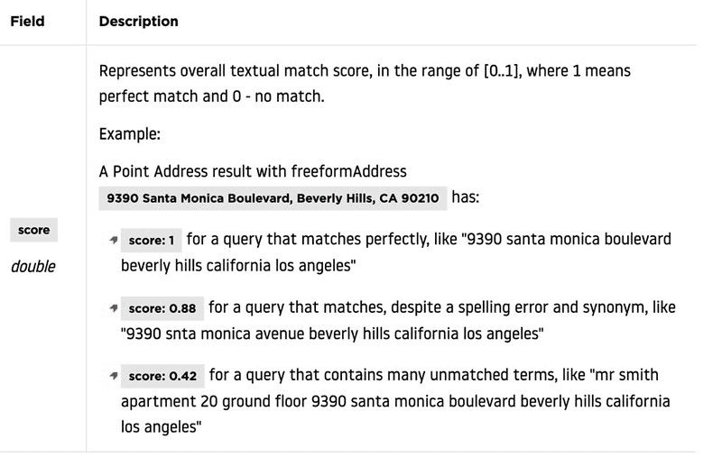 As the names suggest, the summary object contains summary details about the search performed. These details can include the time taken to perform the search, the number of results returned, and similar information. The results array contains a list of the returned coordinates for the Geocoding service and human-readable addresses for the Reverse Geocoding service. The list is sorted in descending order using the score metric. The score metric is applied to the result of the query. The larger the score, the higher the probability that a result meets the query criteria.