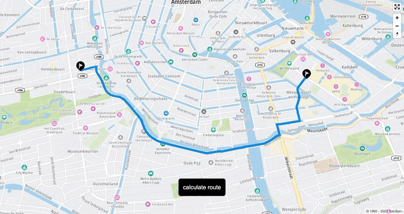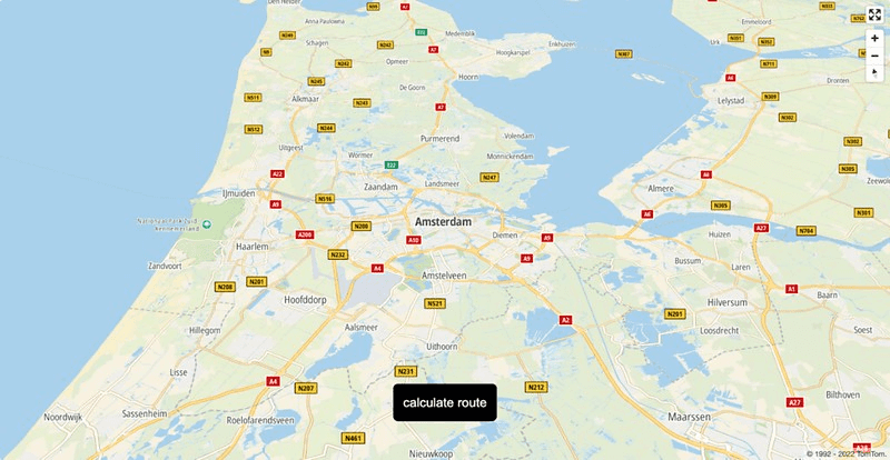1import * as React from "react";2import {useEffect, useRef} from "react";34// CSS styles5import "./index.css";67// TomTom SDK8import * as tt from "@tomtom-international/web-sdk-maps";9import * as tts from "@tomtom-international/web-sdk-services";10import "@tomtom-international/web-sdk-maps/dist/maps.css";1112export default function Home () {13 const API_KEY = "YOUR_API_KEY";14 const AMSTERDAM = {lon: 4.896029, lat: 52.371807};1516 const map = useRef();17 const mapContainer = useRef();1819 function createRoute () {20 const routeOptions = {21 key: API_KEY,22 locations: [23 [4.91191, 52.36619],24 [4.87631, 52.36366],25 ],26 travelMode: "truck",27 vehicleCommercial: true,28 vehicleHeading: 0,29 };3031 tts.services.calculateRoute(routeOptions).then((response) => {32 routeOptions?.locations.map((store) =>33 new tt.Marker().setLngLat(store).addTo(map.current)34 );3536 var geojson = response.toGeoJson();37 map.current.addLayer({38 id: "route" + Math.random(100000),39 type: "line",40 source: {41 type: "geojson",42 data: geojson,43 },44 paint: {45 "line-color": "#0f8ae2",46 "line-width": 8,47 },48 });4950 var bounds = new tt.LngLatBounds();51 geojson.features[0].geometry.coordinates.forEach(function (point) {52 bounds.extend(tt.LngLat.convert(point)); // creates a bounding area53 });54 map.current.fitBounds(bounds, {55 duration: 300,56 padding: 50,57 maxZoom: 14,58 }); // zooms the map to the searched route59 });60 }6162 useEffect(() => {63 map.current = tt.map({64 key: API_KEY,65 container: mapContainer.current.id,66 center: AMSTERDAM,67 zoom: 10,68 language: "en-GB",69 });7071 map.current.addControl(new tt.FullscreenControl());72 map.current.addControl(new tt.NavigationControl());7374 return () => {75 map.current.remove();76 };77 //eslint-disable-next-line78 }, []);7980 return (81 <div className="">82 <div className="container">83 <div ref={mapContainer} className="map" id="map" />84 <button85 className="btn"86 onClick={(e) => {87 e.preventDefault();88 createRoute();89 }}90 >91 calculate route92 </button>93 </div>94 </div>95 );96}