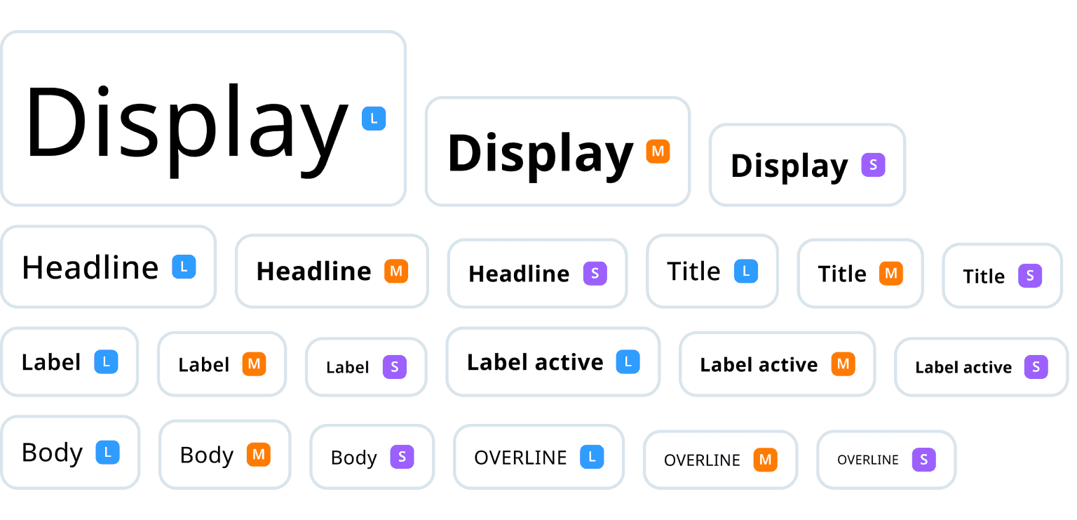 - A set of those styles we assign to six roles that are named to describe their purpose: display, headline, title, label, body and overline.