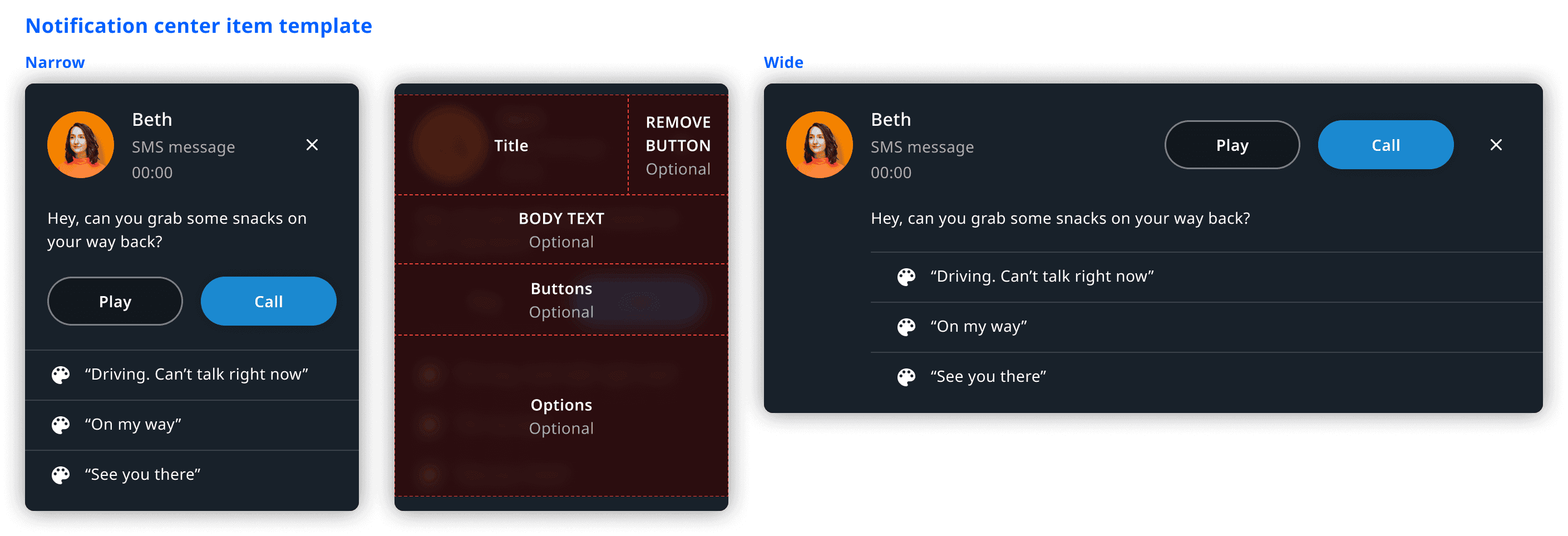Most notifications follow the same template and can be built with a single configurable UI component. We strongly recommend to use the template for creating new notifications. It comprises a set of optional fields that can be combined to cover almost all use cases, and adapts to both narrow and wide containers. Furthermore, it shows the notification creation time when displayed in the notification center container. Finally, when shown in a wide notification center container, a close button is added to the notification. To adjust the template to suit a custom system UI, you can use custom fragment customization. The following images are examples of a possible structure.