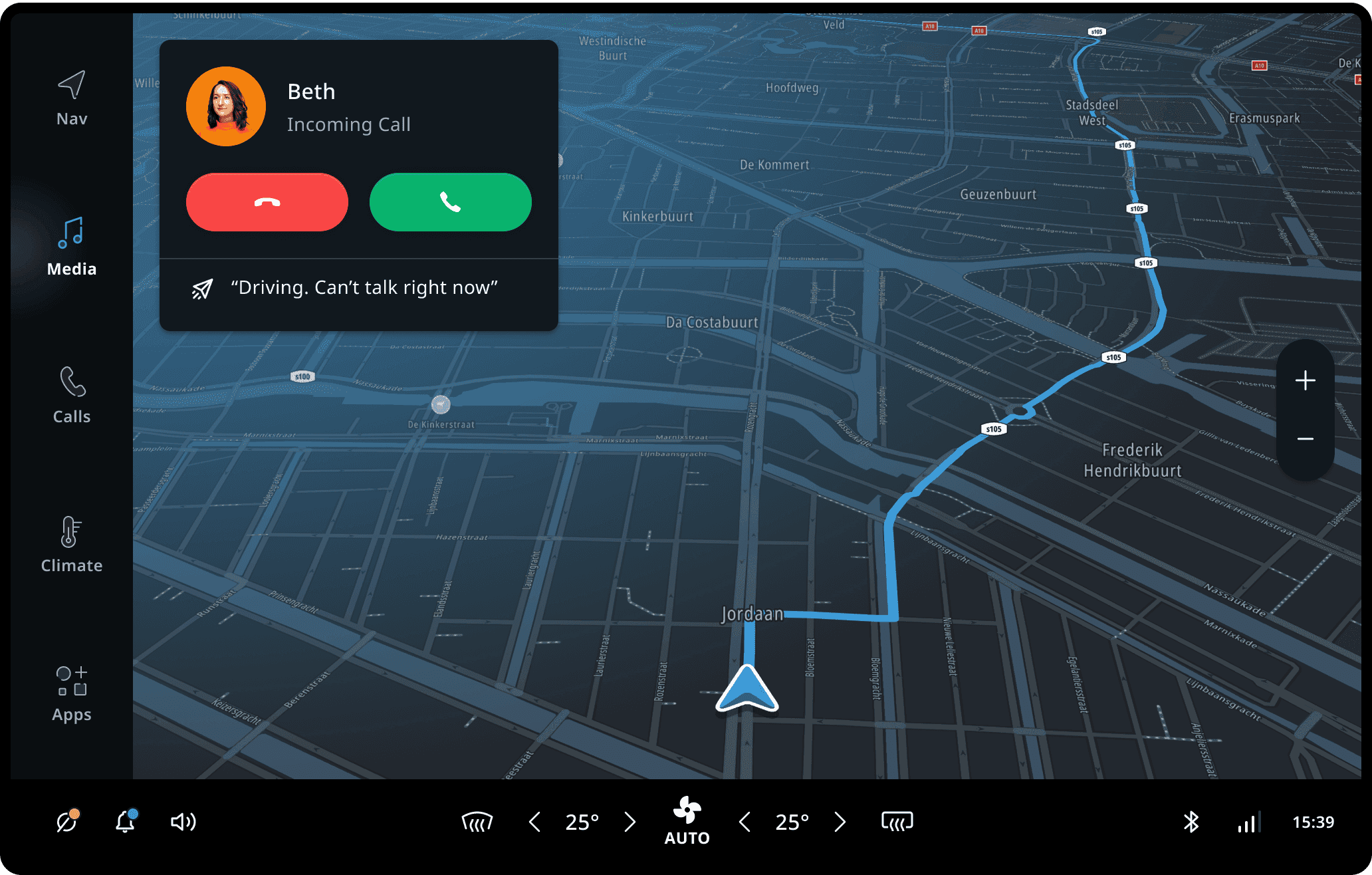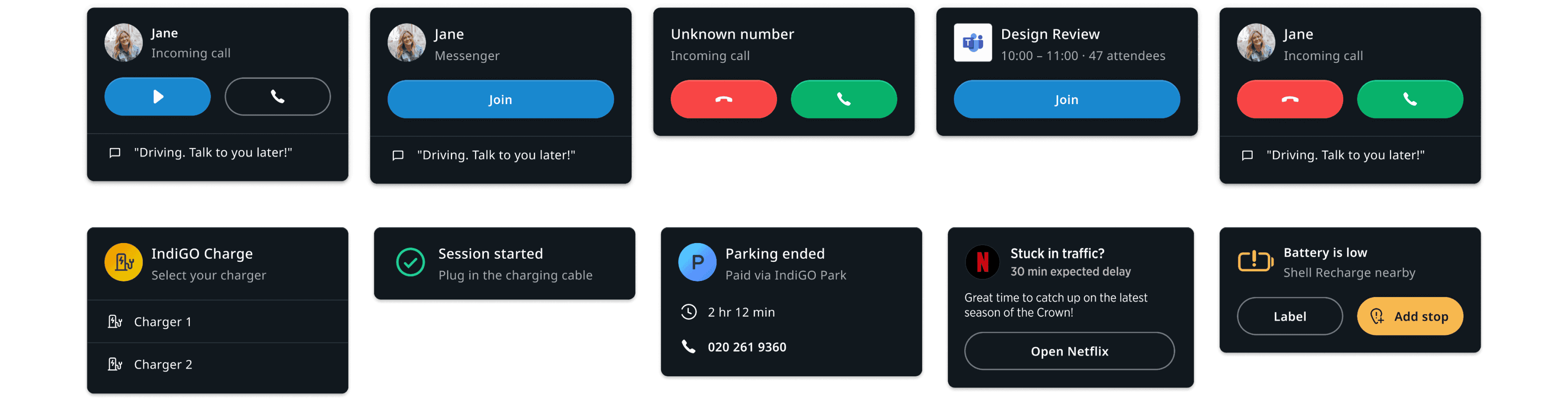 Notifications are pieces of information that are relevant to the user, but typically are not a direct result of user input. They may be presented on the top layer of the system UI as Heads-Up Notifications (HUNs) and/or in a centralized notification history of non-dismissed notifications (Notification Center). Most notifications (except for the voice assistant display cards) are configured using a UI template and a set of properties. A set of rules determines which notifications to show in which context. Through this interface, metadata such as the priority, can be passed to the system UI. The system UI uses this metadata to determine when and how to show the notification. For example, it may choose to suppress a low priority notification while a higher priority notification is active, to avoid distracting the driver. Notifications may be dismissed by the user through system UI functionality, like swiping it away.