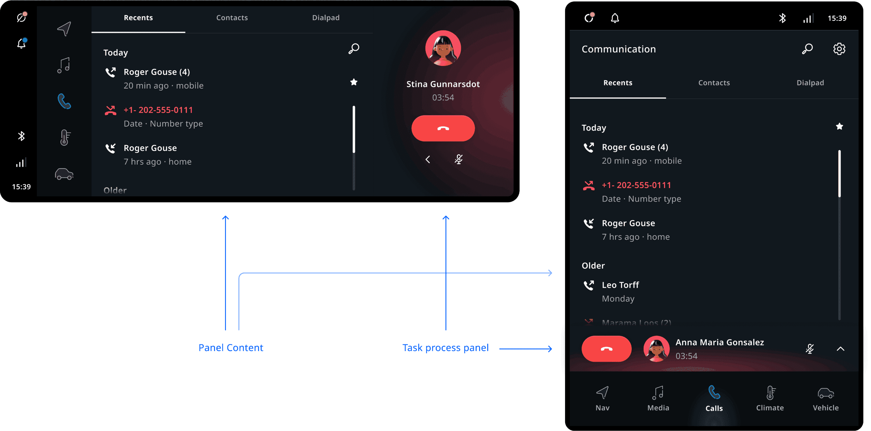 The layout template for the type of task panel can determine which side of the task panel shows a task process panel (for example, in the media or communication app). The following example visualizes how a process panel could be moved to the side on certain screen sizes.